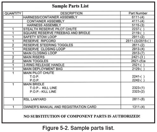 compatible and approved by the manufacturer. Figure 5-2 shows a sample parts list for a typical sport parachute,