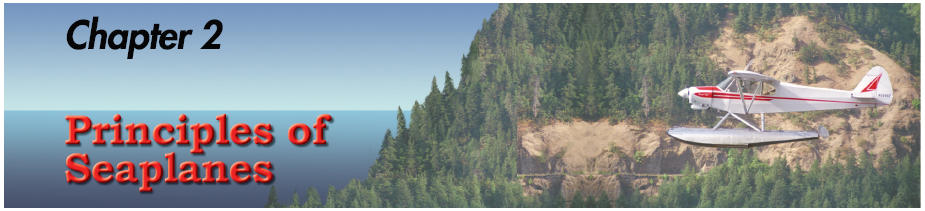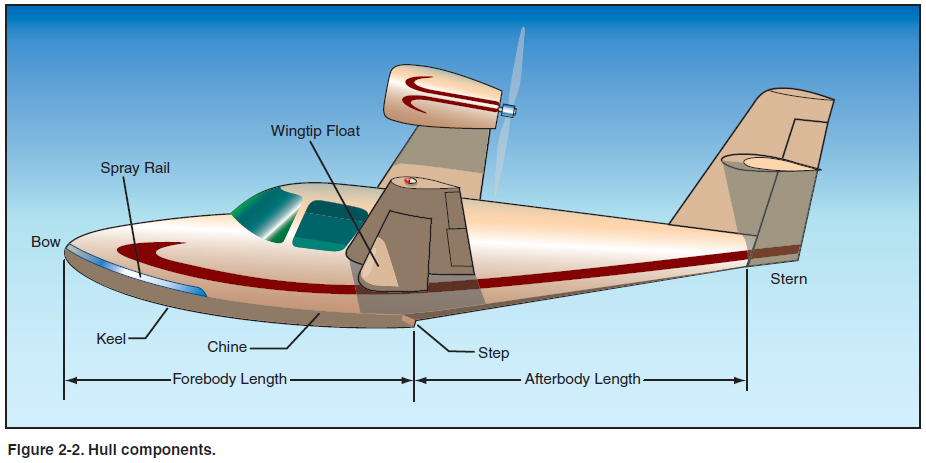 There are considerable differences between handling a floatplane and a flying boat on the water, but similar principles govern the procedures and techniques for both. This book primarily deals with floatplane operations, but with few exceptions, the explanations given here also apply to flying boats. A number of amphibious hull seaplanes have their engines mounted above the fuselage. These seaplanes have unique handling characteristics both on the water and in the air. Because the thrust line is well above the center of drag, these airplanes tend to nose down when power is applied and nose up as power is reduced. This response is the opposite of what pilots have come to expect in most other airplanes, and can lead to unexpected pitch changes and dangerous situations if the pilot is not thoroughly familiar with these characteristics. Pilots transitioning to a seaplane with this configuration should have additional training. Many of the terms that describe seaplane hulls and floats come directly from the nomenclature of boats and ships. Some of these terms may already be familiar, but they have specific meanings when applied to seaplanes. Figures 2-2 and 2-3 describe basic terms, and the glossary at the end of this book defines additional terms.