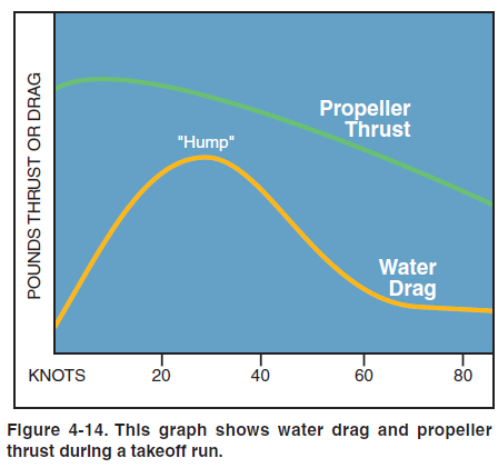 SKIPPING Skipping is a form of instability that may occur when landing at excessive speed with the nose at too high a pitch angle. This nose-up attitude places the seaplane at the upper trim limit of stability and causes the seaplane to enter a cyclic oscillation when touching the water, which results in the seaplane skipping across the surface. This action is similar to skipping flat stones across the water. Skipping can also occur by crossing a boat wake while taxiing on the step or during a takeoff. Sometimes the new seaplane pilot confuses a skip with a porpoise, but the pilot’s body sensations can quickly distinguish between the two. Askip gives the body vertical “G” forces, similar to bouncing a landplane. Porpoising is a rocking chair type forward and aft motion feeling. To correct for skipping, first increase back pressure on the elevator control and add sufficient power to prevent the floats from contacting the water. Then establish the proper pitch attitude and reduce the power gradually to allow the seaplane to settle gently onto the water. Skipping oscillations do not tend to increase in amplitude, as in porpoising, but they do subject the floats and airframe to unnecessary pounding and can lead to porpoising. TAKEOFFS A seaplane takeoff may be divided into four distinct phases: (1) The displacement phase, (2) the hump or plowing phase, (3) the planing or on the step phase, and (4) the lift-off. The displacement phase should be familiar from the taxiing discussion. During idle taxi, the displacement of water supports nearly all of the seaplane’s weight. The weight of the seaplane forces the floats down into the water until a volume that weighs exactly as much as the seaplane has been displaced. The surface area of the float below the waterline is called the wetted area, and it varies depending on the seaplane’s weight. An empty seaplane has less wetted area than when it is fully loaded. Wetted area is a major factor in the creation of drag as the seaplane moves through the water. As power is applied, the floats move faster through the water. The water resists this motion, creating drag. The forward portion of the float is shaped to transform the horizontal movement through the water into an upward lifting force by diverting the water downward. Newton’s Third Law of Motion states that for every action, there is an equal and opposite reaction, and in this case, pushing water downward results in an upward force known as hydrodynamic lift. In the plowing phase, hydrodynamic lift begins pushing up the front of the floats, raising the seaplane’s nose and moving the center of buoyancy aft. This, combined with the downward pressure on the tail generated by holding the elevator control all the way back, forces the rear part of the floats deeper into the water. This creates more wetted area and consequently more drag, and explains why the seaplane accelerates so slowly during this part of the takeoff. This resistance typically reaches its peak just before the floats are placed into a planing attitude. Figure 4-14 shows a graph of the drag forces at work during a seaplane takeoff run. The area of greatest resistance is referred to as the hump because of the shape of the water drag curve. During the plowing phase, the increasing water speed generates more and more hydrodynamic lift. With more of the weight supported by hydrodynamic lift, proportionately less is supported by displacement and the floats are able to rise in the water. As they do, there is less wetted area to cause drag, which allows more acceleration, which in turn increases hydrodynamic lift. There is a limit to how far this cycle can go, however, because as speed builds, so does the amount of drag on the remaining wetted area. Drag increases as the square of speed, and eventually drag forces would balance the power output of the engine and the seaplane would continue along the surface without further acceleration.