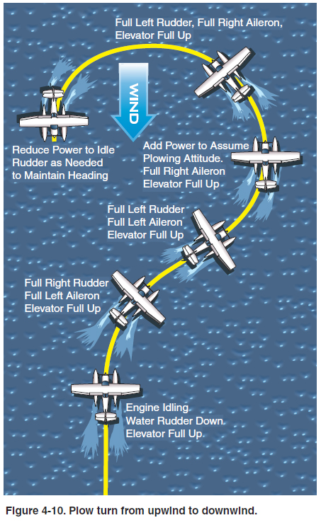 To execute a plow turn, begin with a turn to the right, then use the weathervaning force combined with full left rudder to turn back to the left. As the seaplane passes its original upwind heading, add enough power to place it into the plow position, continuing the turn with the rudder. As the seaplane comes to the downwind heading, reduce power and return to an idle taxi. From above, the path of the turn looks like a question mark. [Figure 4-10]