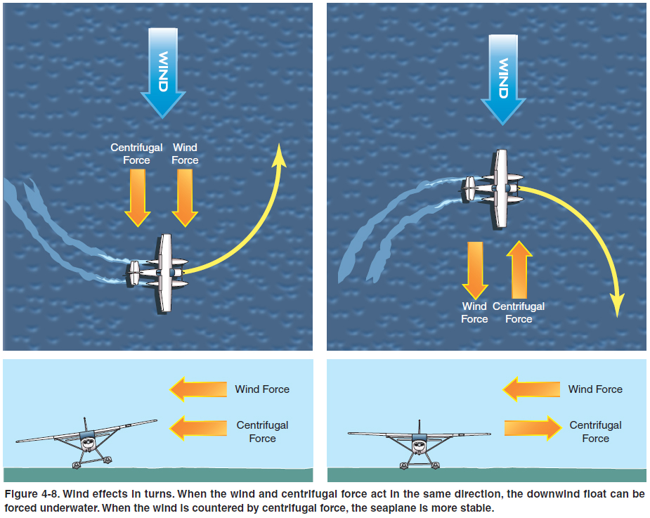 TURNS At low speeds and in light winds, make turns using the water rudders, which move in conjunction with the air rudder. As with a landplane, the ailerons should be positioned to minimize the possibility of the wind lifting a wing. In most airplanes, left turns are somewhat easier and can be made tighter than right turns because of torque. If water rudders have the proper amount of movement, most seaplanes can be turned within a radius less than the span of the wing in calm conditions or a light breeze. Water rudders are usually more effective at slow speeds because they are acting in comparatively undisturbed water. At higher speeds, the stern of the float churns the adjacent water, causing the water rudder to become less effective. The dynamic pressure of the water at high speeds may tend to force the water rudders to swing up or retract, and the pounding can cause damage. For these reasons, water rudders should be retracted whenever the seaplane is moving at high speed. The weathervaning tendency is more evident in seaplanes, and the taxiing seaplane pilot must be constantly aware of the wind’s effect on the ability to maneuver. In stronger winds, weathervaning forces may make it difficult to turn downwind. Often a short burst of power provides sufficient air over the rudder to overcome weathervaning. Since the elevator is held all the way up, the airflow also forces the tail down, making the water rudders more effective. Short bursts of power are preferable to a longer, continuous power application. With continuous power, the seaplane accelerates, increasing the turn radius. The churning of the water in the wake of the floats also makes the water rudders less effective. At the same time, low cooling airflow may cause the engine to heat up. During a high speed taxiing turn, centrifugal force tends to tip the seaplane toward the outside of the turn. When turning from an upwind heading to a downwind heading, the wind force acts in opposition to centrifugal force, helping stabilize the seaplane. On the other hand, when turning from downwind to upwind, the wind force against the fuselage and the underside of the wing increases the tendency for the seaplane to lean to the outside of the turn, forcing the downwind float deeper into the water. In a tight turn or in strong winds, the combination of these two forces may be sufficient to tip the seaplane to the extent that the downwind float submerges or the outside wing drags in the water, and may even flip the seaplane onto its back. The further the seaplane tips, the greater the effect of the crosswind, as the wing presents more vertical area to the wind force. [Figure 4-8]