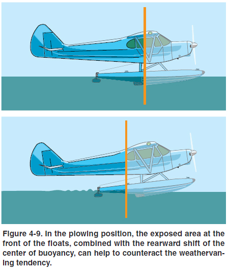 When making a turn into the wind from a crosswind condition, often all that is necessary to complete the turn is to neutralize the air rudder and allow the seaplane to weathervane into the wind. If taxiing directly downwind, use the air rudder momentarily to get the turn started, then let the wind complete the turn. Sometimes opposite rudder may be needed to control the rate of turn. Stronger winds may make turns from upwind to downwind more difficult. The plow turn is one technique for turning downwind when other methods are inadequate, but this maneuver is only effective in certain seaplanes. It takes advantage of the same factor that reduces a floatplane’s yaw stability in flight: the large vertical area of the floats forward of the center of gravity. In the plowing attitude, the front portion of each float comes out of the water, presenting a large vertical surface for the wind to act upon. This tends to neutralize the weathervaning force, allowing the turn to proceed. At the same time, the center of buoyancy shifts back. Since this is the axis around which the seaplane pivots while on the water, more of the fuselage is now forward of the axis and less is behind, further decreasing the weathervaning tendency. In some seaplanes, this change is so pronounced in the plowing attitude that they experience reverse weathervaning, and tend to turn downwind rather than into the wind. Experienced seaplane pilots can sometimes use the throttle as a turning device in high wind conditions by increasing power to cause a nose-up position when turning downwind, and decreasing power to allow the seaplane to weathervane into the wind. [Figure 4-9]