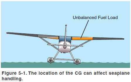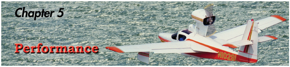 PERFORMANCE CONSIDERATIONS FOR TAKEOFF, CLIMB, CRUISE, AND LANDING Since many pilots are accustomed to a certain level of performance from a specific make and model of land airplane, the changes in performance when that same airplane is equipped with floats can lead to trouble for a careless or complacent pilot. Floats weigh somewhat more than the wheeled landing gear they replace, but floats are designed to produce aerodynamic lift to offset some of the weight penalty. Generating lift inevitably creates induced drag, which imposes a small reduction in overall performance. By far the greatest impact on performance comes from the parasitic drag of the floats. TAKEOFF In a landplane, takeoff distance increases with additional takeoff weight for two reasons: it takes longer for the engine and propeller to accelerate the greater mass to lift-off speed, and the lift-off speed itself is higher because the wings must move faster to produce the extra lift required. For seaplanes, there are two more factors, both due to water drag. As seaplane weight increases, the floats sink deeper into the water, creating more drag during initial acceleration. As with the landplane, the seaplane must also accelerate to a higher airspeed to generate more lift, but the seaplane must overcome significantly more water drag force as speed increases. This extra drag reduces the rate of acceleration and results in a longer takeoff run. Naturally, the location of the additional weight within the seaplane affects center of gravity (CG) location. Because of the way the floats respond to weight, the CG location affects the seaplane’s handling characteristics on the water. If the CG is too far aft, it may be impossible to put the seaplane on the step. If the CG is located to one side of the centerline, one float will be pushed deeper into the water, resulting in more water drag on that side. Be sure to balance the fuel load between left and right wing tanks, and pay attention to how baggage or cargo is secured, so that the weight is distributed somewhat evenly from side to side. [Figure 5-1]