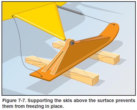 LANDINGS Landing a skiplane is easy compared to landing with wheels; however, for off-airport landings, extra precautions are necessary. Be careful in choosing a landing site. Before landing, evaluate the site to be sure a safe departure will be possible. Upon arriving at a prospective landing site, a pass should be made over the landing area to determine landing direction, and to determine if a safe approach and landing can be completed. A trial landing should be accomplished to determine the best approach, subsequent departure path, and the quality of the surface. To perform the trial landing, plan and configure for a soft-field landing with a stable approach. Then perform a gentle soft-field touchdown, controlled with power, while remaining near takeoff speed for approximately 600 to 800 feet, and then initiating a go-around Atrial landing is very helpful in determining the depth and consistency of the snow, evaluating surface conditions, and looking for possible hazards. Be prepared to go around if at any time the landing does not appear normal or if a hazard appears. Do not attempt to land if the ski paths from the trial landing turn black. This indicates “overflow” water beneath the snow wetting the tracks. When landing on a level surface, and the wind can be determined, make the landing into the wind. If landing on a slope, an uphill landing is recommended. To avoid a hard landing, fly the skiplane all the way to the surface and add some power just before touchdown. Be sure to turn the skiplane crosswise to the slope before it stops. Otherwise it may slide backward down the slope. When using combination skis to land on solid ice without the benefit of snow, it is better to land with the wheels extended through the skis to improve the ground handling characteristics. Solid or clear ice surfaces require a much greater landing distance due to the lack of friction. The skiplane also needs more area for turns when taxiing. If the surface has little or no friction, consider the possibility of a groundloop, since the center of gravity is typically behind the main skis and the tail ski may not resist side movement. Keep the skiplane straight during the runout, and be ready to use a burst of power to provide airflow over the rudder to maintain directional control. Under bright sun conditions and without brush or trees for contrast, glare may restrict vision and make it difficult to identify snowdrifts and hazards. Glare can also impair depth perception, so it is usually best to plan a soft-field landing when landing off airports. After touchdown on soft snow, use additional power to keep the skiplane moving while taxiing to a suitable parking area and turning the skiplane around. Taxi slowly after landing to allow the skis to cool down prior to stopping. Even though they are moving against cold surfaces, skis warm up a few degrees from the friction and pressure against the surface. Warm skis could thaw the snow beneath them when parked, causing the skis to freeze to the surface when they eventually cool. PARKING/POSTFLIGHT Skiplanes do not have any parking brakes and will slide on inclines or sloping surfaces. Park perpendicular to the incline and be prepared to block or chock the skis to prevent movement. When parked directly on ice or snow, skis may freeze to the surface and become very difficult to free. This happens when there is liquid water under the skis that subsequently freezes. If both the surface and the skis are well below freezing, there will be no problem, but if the skis are warm when the airplane stops, they melt the surface slightly, then the surface refreezes as the heat flows into the ground. Similarly, the weight of the skiplane places pressure on the skis, and pressure generates heat. If the ambient temperature goes up to just below freezing, the heat of pressure can melt the surface under the skis. Then as the temperature drops again, the skis become stuck. If parking for a considerable amount of time, support the skis above the snow to prevent them from sticking or freezing to the surface. Place tree boughs, wood slats, or other materials under the skis to help prevent them from becoming frozen to the surface. [Figure 7-7] Some pilots apply a coat of non-stick cooking spray or engine oil to the polypropylene ski surface to prevent ice or snow from sticking during the next takeoff.
