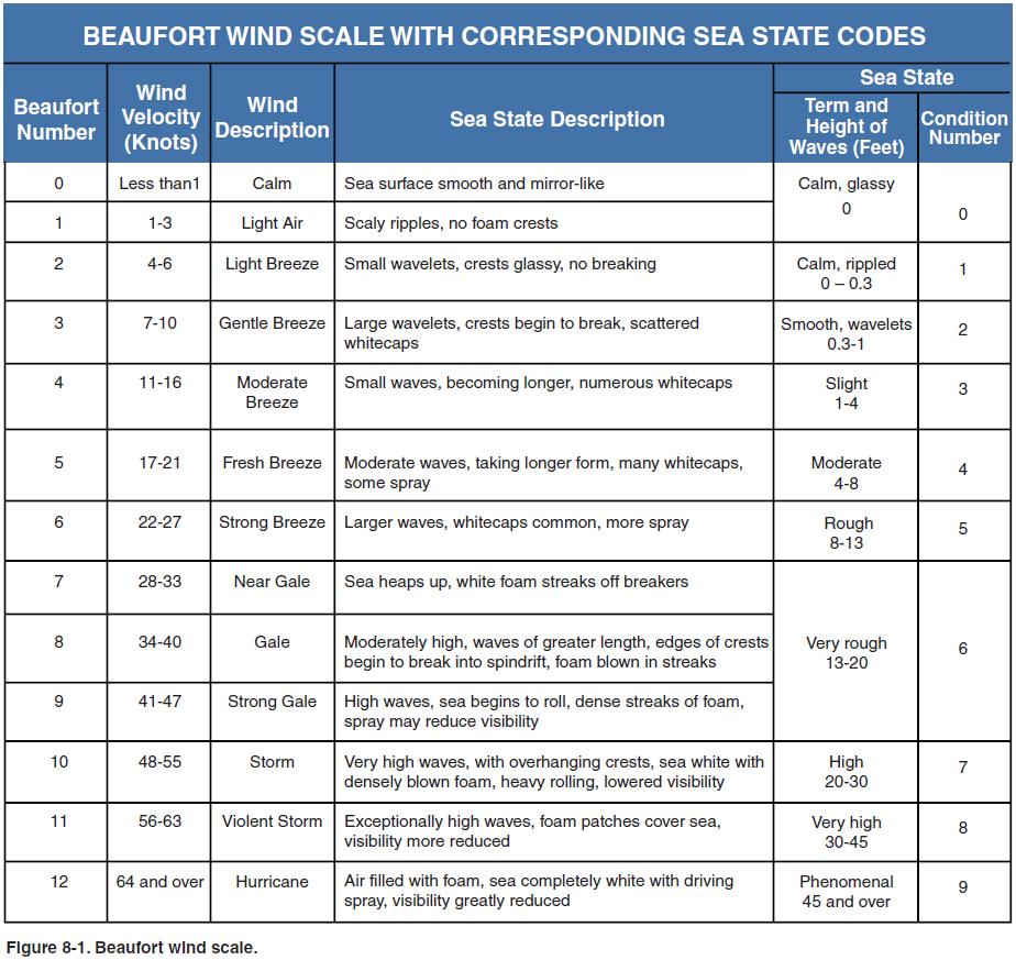 OPERATIONS IN OPEN SEAS Open sea operations are very risky and should be avoided if possible. If an open sea landing cannot be avoided, a thorough reconnaissance and evaluation of the conditions must be performed to ensure safety. The sea usually heaves in a complicated crisscross pattern of swells of various magnitudes, overlaid by whatever chop the wind is producing. A relatively smooth spot may be found where the cross swells are less turbulent. Both a high and a low reconnaissance are necessary for accurate evaluation of the swell systems, winds, and surface conditions. DEFINITIONS When performing open sea operations, it is important to know and understand some basic ocean terms. A thorough knowledge of these definitions allows the pilot to receive and understand sea condition reports from other aircraft, surface vessels, and weather services. Fetch—An area where wind is generating waves on the water surface. Also the distance the waves have been driven by the wind blowing in a constant direction without obstruction. Sea—Waves generated by the existing winds in the area. These wind waves are typically a chaotic mix of heights, periods, and wavelengths. Sometimes the term refers to the condition of the surface resulting from both wind waves and swells. Swell—Waves that persist outside the fetch or in the absence of the force that generated them. The waves have a uniform and orderly appearance characterized by smooth, regularly spaced wave crests. Primary Swell—The swell system having the greatest height from trough to crest. Secondary Swells—Swell systems of less height than the primary swell. Swell Direction—The direction from which a swell is moving. This direction is not necessarily the result of the wind present at the scene. The swell encountered may be moving into or across the local wind. A swell tends to maintain its original direction for as long as it continues in deep water, regardless of changes in wind direction. Swell Face—The side of the swell toward the observer. The back is the side away from the observer. Swell Length—The horizontal distance between successive crests. Swell Period—The time interval between the passage of two successive crests at the same spot in the water, measured in seconds. Swell Velocity—The velocity with which the swell advances in relation to a fixed reference point, measured in knots. (There is little movement of water in the horizontal direction. Each water particle transmits energy to its neighbor, resulting primarily in a vertical motion, similar to the motion observed when shaking out a carpet.) Chop—A roughened condition of the water surface caused by local winds. It is characterized by its irregularity, short distance between crests, and whitecaps. Downswell—Motion in the same direction the swell is moving. Upswell—Motion opposite the direction the swell is moving. If the swell is moving from north to south, a seaplane going from south to north is moving upswell. SEA STATE EVALUATION Wind is the primary cause of ocean waves and there is a direct relationship between speed of the wind and the state of the sea in the immediate vicinity. Windspeed forecasts can help the pilot anticipate sea conditions. Conversely, the condition of the sea can be useful in determining the speed of the wind. Figure 8-1 on the next page illustrates the Beaufort wind scale with the corresponding sea state condition number.