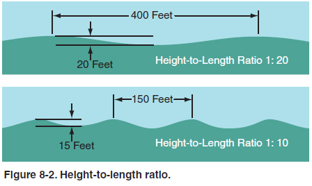 While the height of the waves is important, it is often less of a consideration than the wavelength, or the distance between swells. Closely spaced swells can be very violent, and can destroy a seaplane even though the wave height is relatively small. On the other hand, the same seaplane might be able to handle much higher waves if the swells are several thousand feet apart. The relationship between the swell length and the height of the waves is the height-to-length ratio [Figure 8-2]. This ratio is an indication of the amount of motion a seaplane experiences on the water and the threat to capsizing. For example, a body of water with 20-foot waves and a swell length of 400 feet has a height-tolength ratio of 1:20, which may not put the seaplane at risk of capsizing, depending on the crosswinds.