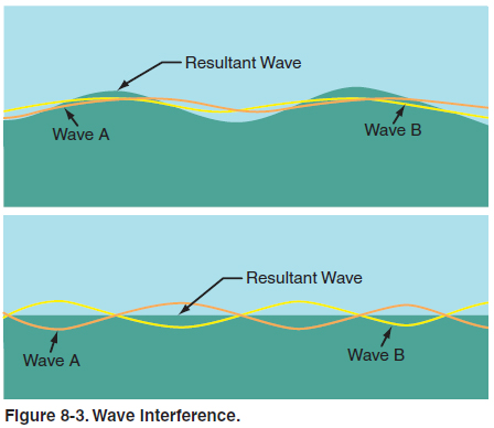 However, 15-foot waves with a length of 150 feet produce a height-to-length ratio of 1:10, which greatly increases the risk of capsizing, especially if the wave is breaking abeam of the seaplane. As the swell length decreases, swell height becomes increasingly critical to capsizing. Thus, when a high swell height-to-length ratio exists, a crosswind takeoff or landing should not be attempted. Downwind takeoff and landing may be made downswell in light and moderate wind; however, a downwind landing should never be attempted when wind velocities are high regardless of swell direction. When two swell systems are in phase, the swells act together and result in higher swells. However, when two swell systems are in opposition, the swells tend to cancel each other or “fill in the troughs.” This provides a relatively flat area that appears as a lesser concentration of whitecaps and shadows. This flat area is a good touchdown spot for landing. [Figure 8-3]