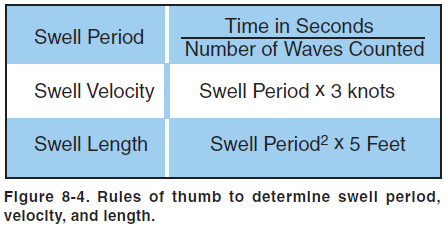 SWELL SYSTEM EVALUATION The purpose of the swell system evaluation is to determine the surface conditions and the best heading and technique for landing. Perform a high reconnaissance, a low reconnaissance, and then a final determination of landing heading and touchdown area. HIGH RECONNAISSANCE During the high reconnaissance, determine the swell period, swell velocity, and swell length. Perform the high reconnaissance at an altitude of 1,500 to 2,000 feet. Fly straight and level while observing the swell systems. Perform the observation through a complete 360º pattern, rolling out approximately every 45º. Fly parallel to each swell system and note the heading, the direction of movement of the swell, and the direction of the wind. To determine the time and distance between crests, and their velocity, follow these directions: