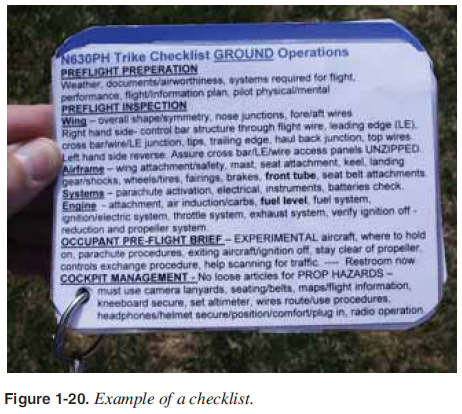 CHAPTER 1. Introduction To Weight-Shift Control Scenario-Based Training A good instructor immediately begins teaching ADM when the student has the ability to control the WSC aircraft confi dently during the most basic maneuvers. The instructor incorporates “scenario-based training” in which the instructor provides pilot, aircraft, environment, and operational risk elements to train the student to utilize ADM in making the best decision for a given set of circumstances. During a profi ciency or practical test, the instructor or examiner evaluates the applicant’s ability to use satisfactory ADM practices as the pilot determines risks and coordinates safe procedures. Resource Management Resource management is similar to that described in the Pilot’s Handbook of Aeronautical Knowledge (FAA-H-8083- 25) except the passenger cannot help in the same ways as in an airplane. The passenger cannot hold or help read the map unless the pilot has provided a knee board or other means for the passenger to assist. [Figure 1-19] ![]() In addition to having the passenger scan the skies for other aircraft, the passenger can maintain control of the aircraft for short periods as the WSC is relatively easy to fl y straight. This permits the pilot to perform unanticipated flight deck functions during fl ight. Overall, prefl ight planning and passenger briefi ngs are additional tasks of resource management for the WSC aircraft. Use of Checklists Checklists have been the foundation of pilot standardization and fl ight deck safety for many years and the fi rst defense against the error chain that leads to accidents. [Figure 1-20] The checklist is an aid to the fallible human memory and helps to ensure that critical safety items are not overlooked or forgotten. However, checklists are of no value if the pilot is not committed to their use. Without discipline and dedication in using a checklist, the odds favor the possibility of an error. ![]() The importance of consistent use of checklists cannot be overstated in pilot training. A major objective in primary fl ight training is to establish habitual patterns that will serve pilots well throughout their fl ying careers. The fl ight instructor must promote a positive attitude toward the use of checklists, and the student pilot must recognize their importance. Because of the evolution of WSC aircraft and their simplicity, it could be thought that written checklists are not required. Nothing is further from the truth. Following good written checklists provides signifi cant safety for human factors, which is the greatest cause of accidents in aviation. Five important written checklists must be used before fl ight. These specifi c checklists are emphasized because of their importance in avoiding pilot errors that can occur before or during fl ight: