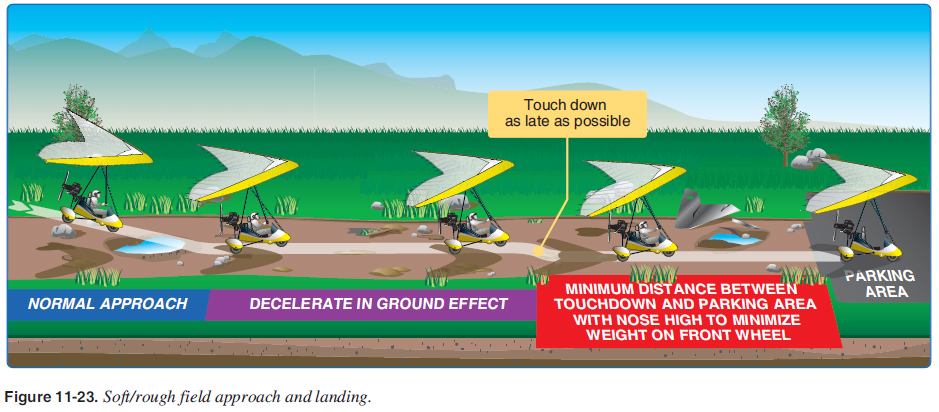 Soft and Rough Field Approaches and Landings Landing on fi elds that are rough or have soft surfaces, such as snow, sand, mud, tall grass, or a rocky/bumpy fi eld requires unique procedures. When landing on such surfaces, the objective is to touch down as smoothly as possible and at the lowest possible landing speed. The pilot must control the aircraft so that the wings support the weight of the aircraft as long as is practical to minimize drag and stresses imposed on the landing gear by the rough or soft surface. Similar to the soft fi eld for takeoff, proper gear—specifi cally big tires with a large wing and overall low weight—should be utilized for soft or rough fi eld operations. Refer to appropriate gear and warnings in Chapter 7, Takeoff and Departure Climbs, for soft or rough fi eld operation as a prerequisite for this chapter. The approach for the soft fi eld landing is similar to the normal approach used for operating into long, fi rm landing areas. The major difference between the two is that, during the soft or rough fi eld landing, the distance on the soft/rough fi eld is minimized and the weight is kept off the wheels by the lift of the wing when on the soft/rough fi eld. Power can be used throughout the level-off and touchdown to ensure touchdown at the lowest possible airspeed, with the WSC aircraft fl own onto the ground with the weight fully supported by the wings. The touchdown should be planned for minimal taxi distance to the stopping point so there is the shortest possible distance with weight on the landing gear on the rough/soft surface. [Figure 11-23]