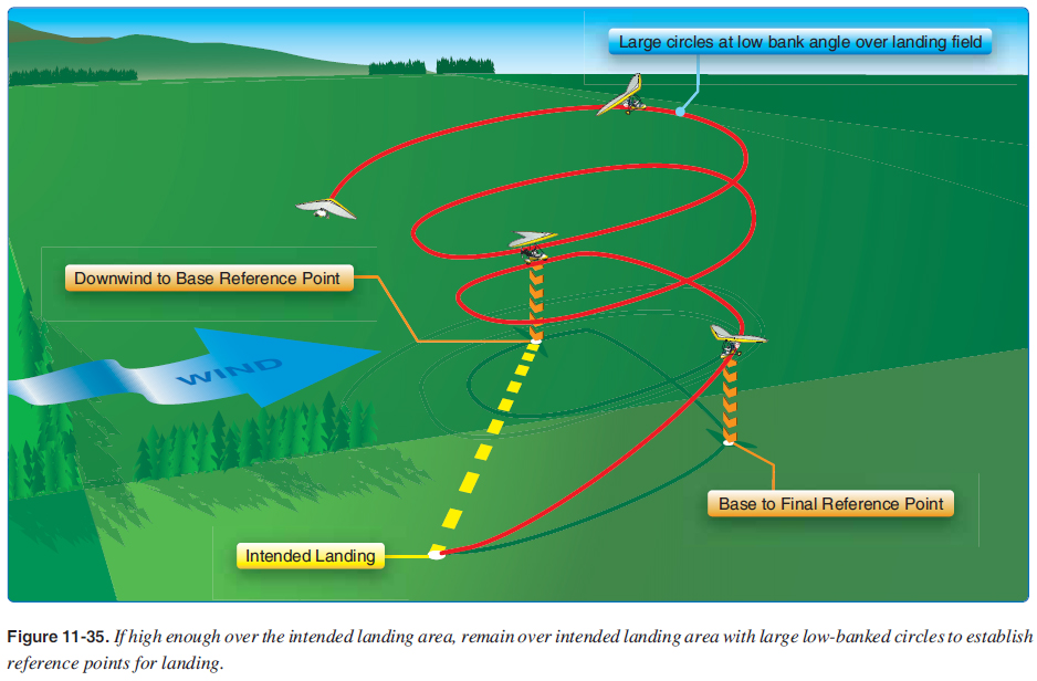 Emergency Approaches and Landings ( Simulated Engine Out) From time to time on dual fl ights, the instructor should give surprise simulated emergency landings by retarding the throttle and calling “simulated emergency landing.” The objective of these simulated emergency landings is to develop pilot accuracy, judgment, planning, procedures, and confi dence. When the instructor calls “simulated emergency landing,” the pilot should immediately establish the best glide speed and the aircraft trimmed (if so equipped) to maintain that speed. A constant gliding speed should initially be maintained because variations of gliding speed nullify all attempts at accuracy in judgment of gliding distance and the landing spot. The many variables, such as altitude, obstruction, wind direction, landing direction, landing surface and gradient, and landing distance requirements of the aircraft determine the pattern and approach procedures to use. Utilizing any combination of normal gliding maneuvers, from wings level to steep turns, the pilot should eventually arrive at the normal reference position at a normal traffi c pattern altitude for the selected landing area. From this point on, the approach is as nearly as possible a normal power-off approach as described previously in the Power-off Accuracy Approaches section. Steep approach techniques may be used for fi nal approach if required. If the student is high above the desired emergency landing area, large low-banked circles above the area should be made and widened or narrowed as required to provide downwind and fi nal reference points for the landing. [Figure 11-35]