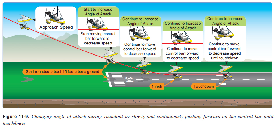 Roundout ( Flare) The roundout is a slow, smooth transition from a normal approach speed to a landing attitude, gradually rounding out the fl ightpath to one that is parallel with, and within a very few inches above, the runway. When the aircraft, in a normal descent, approaches within what appears to be 10 to 15 feet above the ground, the roundout or fl are should be started and be a continuous process slowing until the aircraft touches down on the ground. It should be noted that the terms “roundout” and “fl are” are defi ned and used interchangeably throughout the aviation industry for slowing the aircraft during fi nal approach and touching down. The term “roundout” is used in this handbook since it provides a better description for the WSC landing process and WSC students are more successful learning landings using the term roundout instead of fl are. As the aircraft reaches a height where the back wheels are one to two inches above the ground, the roundout is continued by gradually pushing the control bar forward as required to maintain one to two inches above the runway as the WSC aircraft slows. [Figure 11-9] This causes the aircraft’s nosewheel to gradually rise to the desired landing attitude. The AOA should be increased at a rate that allows the aircraft to continue fl ying just above the runway as forward speed decreases until the control bar is full forward and the back wheels settle onto the runway.