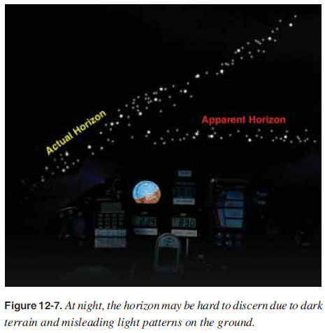 Unique WSC Flight Characteristics If the WSC aircraft is trimmed properly and the pilot is profi cient in the basic fl ight maneuvers of climbs, cruise, and descent procedures, the WSC aircraft speed is easily determined with control bar pressure and position for normal fl ight conditions. A pilot can also determine basic climbs and descents through the feel of the aircraft with the airspeed and throttle positions. Therefore, basic pitch control can be done by a profi cient pilot with his or her eyes closed. As discussed in Chapter 2, Aerodynamics, WSC aircraft are generally not designed to be roll stable, and any engine turning effect or movement of the air can put the WSC aircraft into a roll, which it maintains unless corrected by the pilot. In other words, releasing the control bar in a WSC aircraft will not level a bank back to straight fl ight. The pilot must continually provide input to fl y a constant heading even if this control is small corrections. In other words, the pilot cannot level the wings or fl y a straight heading for very long with his or her eyes closed. To maintain a constant heading or ground track, one of three instruments can be used: magnetic compass, global positioning system (GPS), and aircraft heading indicator. Without a visual reference, these can be used to fl y straight. An attitude indicator can be used on WSC aircraft providing additional instrument reference. These instruments and others are discussed later in this chapter. Night Illusions In addition to night vision limitations, pilots should be aware that night illusions could cause confusion and concerns during night fl ying. The following discussion covers some of the common situations that cause illusions associated with night fl ying. A false horizon can occur when the natural horizon is obscured or not readily apparent. It can be generated by confusing bright stars and city lights. It can also occur while fl ying toward the shore of an ocean or a large lake. Because of the relative darkness of the water, the lights along the shoreline can be mistaken for stars in the sky. [Figure 12-7]