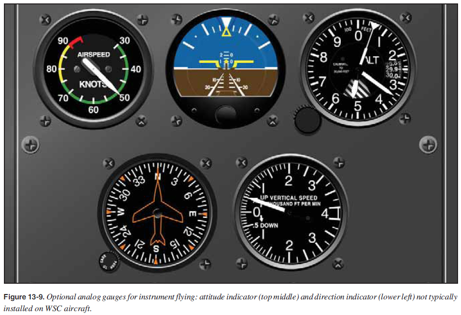 Attitude Control Attitude is defined as “The position of an aircraft as determined by the relationship of its axes and a reference, usually the earth’s horizon.” For WSC, the pitch and the roll are the relevant attitudes. Most aircraft are generally, by design, inherently stable platforms and, except in turbulent air, maintain approximately straight-and-level fl ight if properly trimmed and left alone. They are designed to maintain a state of equilibrium in pitch, roll, and yaw. The pilot must be aware, however, that a change about one axis affects the other axes. The WSC aircraft is stable in the yaw and pitch axes, but less stable in the roll axis. The yaw and pitch axes of the WSC are easy to control, but the roll axis is the challenge for WSC aircraft control in IMC. The key to emergency aircraft attitude and directional control, therefore, is to: