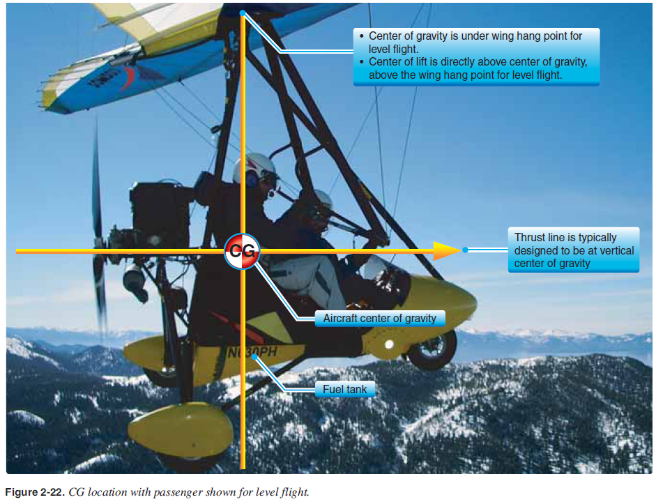 CHAPTER 2. Aerodynamics Ground Effect Ground effect is when the wing is fl ying close to the ground and there is interference of the ground with the airfl ow patterns created by the wing. At the same angle of attack, lift increases slightly and the drag decreases signifi cantly. The most apparent indication from ground effect is the unexpected lift given to an aircraft as it fl ies close to the ground—normally during takeoffs and landings. More details for ground effect aerodynamics are found in the Pilot’s Handbook of Aeronautical Knowledge. Flight characteristics for ground effect are covered in the takeoff and landing chapters. Center of Gravity (CG) The CG is the theoretical point of concentrated weight of the aircraft. It is the point within the WSC aircraft about which all the moments trying to rotate it during fl ight are balanced. The most obvious difference in the CG for a WSC aircraft is the vertical position compared to an airplane, as it is always lower than the wing. The Pilot’s Handbook of Aeronautical Knowledge accurately states the CG is generally in the vertical center of the fuselage. The same is true for the WSC aircraft. However, the WSC wing is higher above the fuselage/carriage and, since most of the weight is centered in the carriage, the CG is well below the wing. In a two-seat WSC aircraft, the second seat is typically behind the pilot’s seat and the CG is usually located close to the rear passenger seat. Therefore, the CG location does not change signifi cantly with a passenger. Fuel tanks are typically located near the vertical CG so any difference in fuel quantity does not signifi cantly change the CG fore and aft with different fuel quantities. For level fl ight, the CG is directly below the wing/carriage attachment point known as the hang point, and the propeller thrust line is typically designed to be near the vertical position of the CG. [Figure 2-22] ![]() |