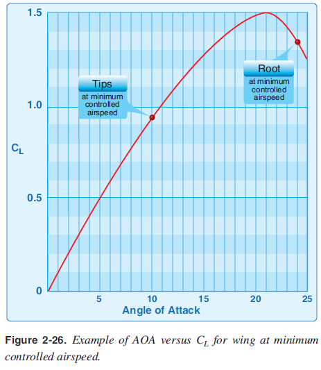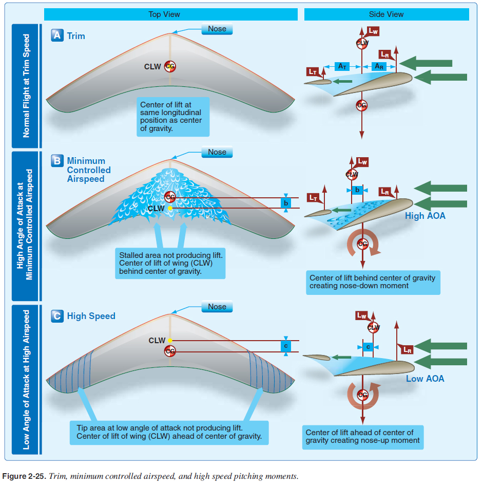 CHAPTER 2. Aerodynamics Longitudinal Axis— Roll Turning is initiated by rolling about the longitudinal axis, into a bank similar to an airplane using aileron and rudder control. To turn, shift the weight to the side in the direction of the turn, increasing the weight on that side. This increases the twist on that side while decreasing the twist on the other side, similar to actuating the ailerons on an airplane. The increased twist on the side with the increased weight reduces the AOA on the tip, reducing the lift on that side and dropping the wing into a bank. The other wing, away from which the weight has been shifted, decreases twist. The AOA increases, increasing the lift on that wing and thereby raising it. Thus, shifting the weight to one side warps the wing (changes the twist) to drop one wing and raise the other, rolling the WSC aircraft about the longitudinal axis. [Figure 2-24] More details on the controls that assist wing warping are covered in chapter 3, which should be considered with use of the controls in the takeoff, landing, and fl ight maneuvers sections of this handbook. ![]() Vertical Axis— Yaw The WSC wing is designed to fl y directly into the relative wind because it does not provide for direct control of rotation about the vertical axis. Stability and Moments A body that rotates freely turns about its CG. In aerodynamic terms for a WSC aircraft, the mathematical value of a moment is the product of the force times the distance from the CG (moment arm) at which the force is applied. Typical airplane wings generally pitch nose down or roll forward and follow the curvature of the upper airfoil camber creating a negative pitching moment. One of the reasons airplanes have tails is to create a downward force at the rear of the aircraft to maintain stabilized fl ight, as explained in greater detail in the Pilot’s Handbook of Aeronautical Knowledge. The WSC wing is completely different and does not need a tail because of two specifi c design differences—a completely different airfoil design creating a more stable airfoil and lifting surfaces fore and aft of the CG, similar to the airplane canard design. WSC Unique Airfoil and Wing Design As shown in Figure 2-2, the WSC airfoil has the high point signifi cantly farther forward than does the typical airplane airfoil. This makes the center of lift for the airfoil farther forward and creates a neutral or positive pitching moment for the airfoil. Most WSC airfoils have this unique design to minimize negative moments or pitch down during fl ight. Additionally, the design of the complete wing is a unique feature that provides stability without a tail. To understand the WSC aircraft pitch stability and moments, examine the wing as two separate components—root chord and tip chord. Trim—Normal Stabilized Flight In Figure 2-25A, during normal unaccelerated fl ight at trim speed, the lift at the root (LR) times the arm to the root (AR) equals the lift of the tip (LT) times the arm to the tip (AT). (LR x AR) + (LT x AT) = 0 LR + LT = Total Lift of the Wing (LW) Adding all the lift from the wing puts the center of lift of the wing (CLW) directly over the CG for stabilized fl ight. [Figure 2-25A] If the pilot wishes to increase the trim speed, the CG is moved forward. This is done by moving the hang point forward on the wing. Similarly, to reduce the trim speed, the hang point/CG is moved rearward on the wing. ![]() High Angles of Attack In Figure 2-25B, if the wing AOA is raised to the point of minimum controlled airspeed at which the wing begins to stall towards the center of the wing (root area), the lift in this area decreases dramatically. The CLW moves back a distance “b” creating a moment to lower the nose. Therefore, the center of lift moves behind the CG at higher angles of attack, creating a nose-down stabilizing moment. The average lift coeffi cient verses AOA is shown for this minimum controlled airspeee root area is partially stalled and the tips are still fl ying. The specifi c stall characteristics of each wing are different and this stall pattern shown here id in Figure 2-26. Ths used for example. ![]() |