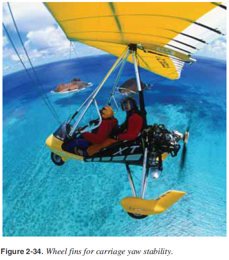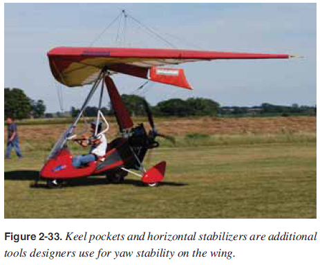 CHAPTER 2. Aerodynamics Yaw Stability and Moments There is no signifi cant turning about the vertical axis because the WSC wing is designed to fl y directly into the relative wind. Any sideways skidding or yaw is automatically corrected to fl y straight with the swept wing design. An airplane uses the vertical tail to stabilize it to fl y directly into the relative wind like a dart. The unique design of the WSC aircraft performs the same function through the swept wing design, but also the wing twist and airfoil shape from root to tip assists in the correction about the vertical axis. A simple way to understand the yaw stability is to see that any yawing motion is reduced simply through the increased area of the wing as it rotates about its vertical axis. [Figure 2-32] ![]() There is a slight amount of adverse yaw similar to an airplane that can be noticed when a roll is fi rst initiated. The amount varies with the specifi c manufacturer’s design and make/ model. In addition, the wing can yaw side to side to some degree, with some different manufacturer’s make/model more than others. The higher performance wings with less twist and a greater nose angle are noted for less yaw stability to gain performance. These wings also require more pilot input and skill to minimize yaw instability through pitch input. An addition to the wing planform, twist, and airfoil shapes to minimize yaw, some wings utilize horizontal stabilizers similar to these in airplanes and others use tip fi ns. [Figure 2-33] Generally, the WSC wing is yaw stable with minor variations that are different for each wing and can be controlled by pilot input, if needed. ![]() Carriage Moments The wing is a signifi cant factor in the design of yaw stability, but the carriage can be a large factor also. If the area in front of the CG is greater than the area in back of the CG, and the wing yaws to the side, then the front would have more drag and create a moment to yaw the WSC aircraft further from the straight fl ight. Therefore, fi ns are sometimes put on the carriage as needed so the carriage also has a yawing aerodynamic force to track the WSC aircraft directly into the wind. [Figure 2-34] ![]() Since the carriage has such a large effect on yaw stability, the carriage is matched to the wing for overall compatibility. Each manufacturer designs the carriage to match the wing and takes into account these unique factors of each design. Yaw Stability Summary These factors make the WSC aircraft track directly into the relative wind and eliminate the need for a rudder to make coordinated turns. Designs and methods vary with manufacturer and wing type, but all WSC wings are designed to track directly into the relative wind. |