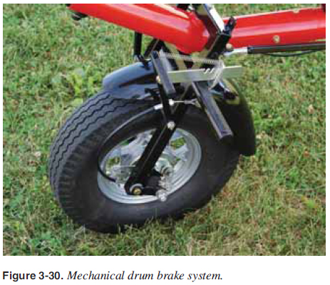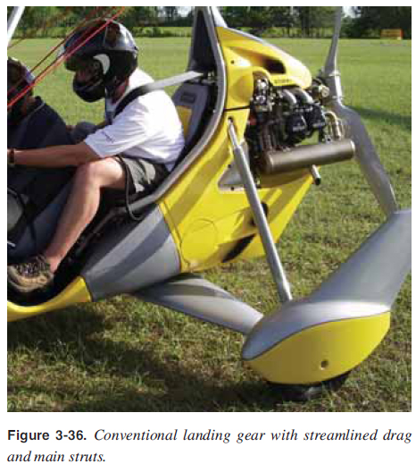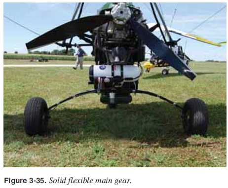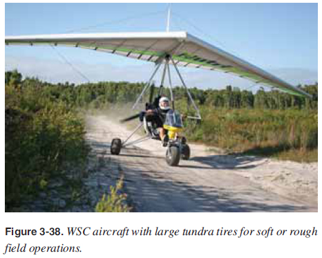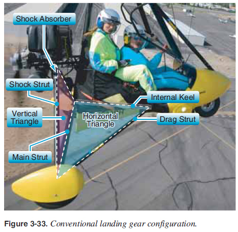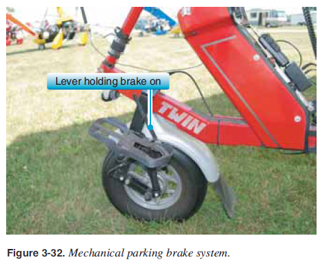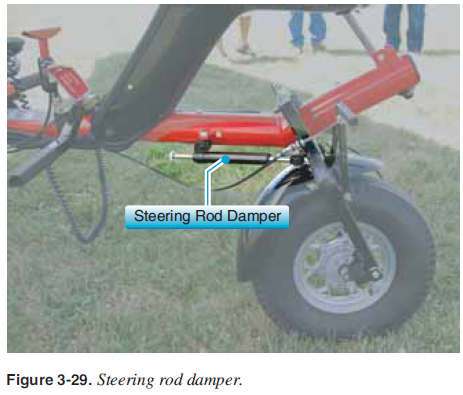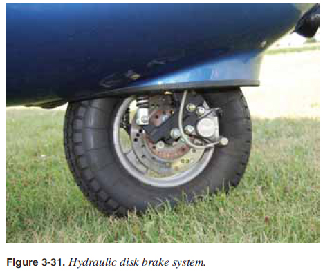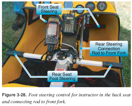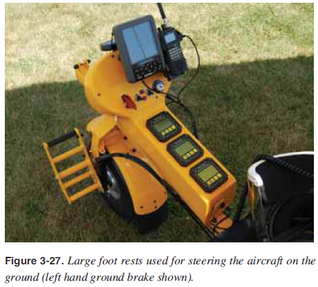 Structure Similar to the wing, the carriage is designed with a number of structural triangles for optimum strength and minimum weight. Each manufacturer and model have specific details that vary, but the carriage structure is typically a mast, keel, and front tube that form the main triangle components of the carriage structure with the wing attachment at the top of the mast. A seat frame attached to the mast and keel provides rigidity to the main components while providing structure for the pilot and passenger. [Figure 3-26] ![]() Landing struts attached to the rear wheels provide structure for the main landing gear, and a front fork provides the landing gear structure for the front wheel. An engine mount attaches to the mast, providing structure for the propulsion system to attach to the carriage. [Figure 3-26] Landing Gear The landing gear provides support to the WSC aircraft on the ground and absorbs the shock to reduce the stresses on the pilot and the aircraft during landings. The landing gear is made up of the front wheel, which has a lighter load and is used for steering, and the main or rear landing gear, which takes most of the load for the aircraft. [Figure 3-26] The front steering fork for the nosewheel has foot rests attached that the pilot uses for steering the WSC aircraft on the ground. Besides ground steering, the foot controls are similar to driving a car, left foot pedal is brakes on the ground only, and right foot is throttle and power on the ground and in fl ight. [Figure 3-27] The front fork typically has camber so it naturally tracks in the direction of travel similar to a motorcycle front fork. ![]() For training, a second steering control is installed with a connecting rod so the instructor can sit in back and steer the carriage on the ground using the nosewheel. [Figure 3-28] Steering dampers are sometimes used to stabilize the front wheel from shimmying at higher speeds during takeoff and landing. [Figure 3-29] The front wheel sometimes has shock absorbers or the tire itself can act as the shock absorber. The front wheel typically has a disk or a drum brake, mechanical or hydraulic. [Figures 3-30 and 3-31] A front brake is lighter and simpler than rear brakes, but some carriage brake systems utilize the rear brakes. ![]() ![]() ![]() ![]() A parking brake is extremely useful for securing the aircraft