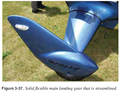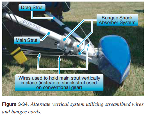 ![]() The main landing gear is the two rear wheels of the WSC aircraft. Since the center of gravity (CG) is much closer to the rear wheels, most of the weight for the aircraft is carried on the rear wheels for taxi, takeoff, and landings. There are a number of different confi gurations for the main gear. A conventional confi guration has two separate systems for each rear wheel. Each side is two structural triangles, one horizontal and one vertical. The horizontal triangle consists of a drag strut from the wheel forward to the keel or forward structure to maintain the wheel’s fore and aft position, and the main landing gear strut. Both the main and the drag struts can pivot about the attachment to the keel as part of the shock system. The vertical triangle consists of the main landing strut and the shock strut attached to the wheel and up to the keel structure [Figure 3-36] or other structure such as the engine mount shown in Figure 3-33, which houses the compressed nitrogen and oil “oleo” shock absorber. ![]() There are a number of other main landing gear confi gurations and shock absorbing systems such as wire bracing with bungee cord shocks [Figure 3-34], fiberglass or flexible (fiberglass or steel) main gears with no struts [Figure 3-35], and any variation of these. Carriages designed for faster speeds may have streamlined landing gear systems. [Figures 3-36 and 3-37] ![]() ![]() ![]() ![]() As discussed in the nosewheel section, the carriage can have main landing gear brakes on both main landing gear wheels that can be drum or disk and controlled by mechanical or hydraulic actuation. Each manufacturer has different designs and options. Tires can also assist as shock absorbers for landings. Large tundra tires add signifi cant shock absorbing capability and are used for operations on soft fi elds, rough fi elds, and sand. [Figure 3-38] Generally, the faster WSC aircraft used for airport operations have narrower tires to eliminate drag. ![]() |