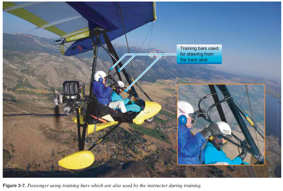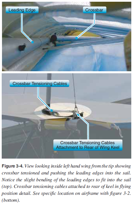 Crossbar The crossbar is two aluminum tube sections hinged above the keel that attach to the leading edges. The crossbar is tensioned back with the crossbar tensioning cables, which pushes the leading edges forward to conform to the sail. These crossbar tensioning cables are attached at the rear of the keel when the wing is tensioned into fl ying position. [Figure 3-4] ![]() These crossbar sections are under a compression load and designed to be stiff with no bending. A larger diameter tube is typically used to avoid any bending when the wing is fl ying. A ding, dent, or bend in the crossbar could spell disaster during fl ight because it is one of the main structural members that holds leading edges into position during fl ight. For wing take down and packing, the crossbar haul back cables are released, the crossbar hinged center moves forward, and the leading edges rotate in toward the keel about the nose plates and come together, allowing the wing to fold down into a long tube for transport and/or storage. Control Frame The triangle-shaped control frame serves two main purposes. It provides the lower structure for the wing and is the control bar for the pilot. The control frame is bolted to the keel with two downtubes extending from the keel attachment to the horizontal base tube, which is the pilot’s control bar. [Figures 3-2, 3-5, and 3-6] ![]() ![]() ![]() Control frame corner brackets at the bottom of the downtubes provide the wing structural attachments for the fl ying cables or struts that attach to each leading edge/crossbar junction, and secure the control bar fore and aft to the wing with the front and back wires attached to nose plates and the aft section of the keel. [Figures 3-5 and 3-6] During fl ight, the downtubes are similar in compression to the crossbar and must be stiff and straight to maintain structural integrity. The base tube/control bar is under tension during fl ight. Front and rear fl ying wires hold the control frame in place fore and aft. Side fl ying wires hold the control frame in place side to side and provide structure to hold the wings in place while fl ying. [Figures 3-2, 3-5, and 3-6] Strutted wings use struts in place of the side fl ying wires, which is discussed later in this chapter. Training bars are added for dual controls so the person in back can fl y the aircraft. These are typically used by an instructor for training but can be used by a passenger in the back also. [Figure 3-7] ![]() |