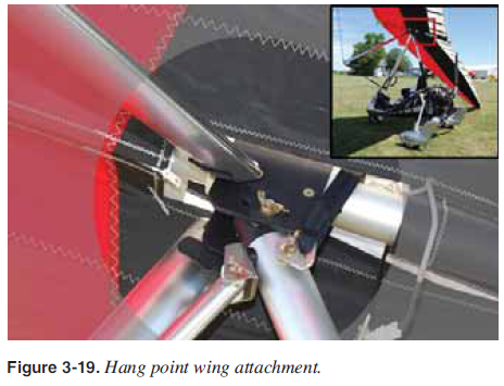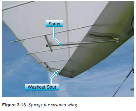 Wing Systems Refl ex Systems As discussed in the aerodynamics section, the trailing edge near the root and the tips must stay up during unusually low or negative angles of attack [Figure 2-29] to maintain a positive pitch stability for the aircraft. There are a number of refl ex systems used to accomplish this in emergency situations. ![]() Refl ex cables—most wings with a king post use cables to hold the trailing edge up at unusually low or negative angles of attack. These refl ex cables are secured to the top of the king post and attach to several positions on the trailing edge where the battens are located. Different manufacturers have different positions where these are attached, depending on the design of the wing. Refl ex cables also provide additional refl ex at high speeds because the drag of the wires pulls up the trailing edge, creating more refl ex at these higher speeds. [Figure 3-16] ![]() Washout struts—tubes near the tips that keep the tip trailing edge up during very low or negative angles of attack. They can be inside or outside the double surface of a wing. The refl ex cables may not go to the wingtip, so washout struts are used to hold up the trailing edge at the tip at very low and negative angles of attack. [Figure 3-17] ![]() Sprogs—for wings using struts with no king post, sprogs are used to keep the inboard trailing edge up in place of the refl ex cables. A wire attached to the top of the leading edge holds the sprog up in place. [Figure 3-18] ![]() Pitch Control System The pitch control system is a simple hinge on the keel at the hang point that allows the pilot to push the control bar out and pull the control bar in to control pitch. This wing attachment is different for each manufacturer, but all designs have this hang point wing attachment so the control bar is always perpendicular to the longitudinal axis of the aircraft. This raising and lowering of the nose is the pitch control system for the WSC aircraft. [Figures 2-7 and 3-19] ![]() ![]() |