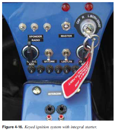 Ignition System The typical ignition system on WSC aircraft provides the spark that ignites the fuel/air mixture in the cylinders and is made up of magneto/generators, control boxes, spark plugs, high-voltage leads, and the ignition switch. For most LSA engines designed specifi cally for aircraft, a magneto/ generator uses a permanent magnet to generate an electric current independent of the aircraft’s electrical system, which might include a battery. The aircraft electrical system can fail—the battery can go dead. However, this has no effect on the ignition system. The electricity from the ignition magneto/generator goes into the ignition control box where the correct voltage is produced and timed to fi re the spark plugs at the proper time. Modern WSC aircraft use an electronic capacitance discharge system that operates without any moving parts to increase reliability and effi ciency. Capacitance Digital Systems (CDI) operate similarly but they have the ability to change the timing of the spark for different rpm. Consult the POH for the particular system for each engine. The system begins to fi re when the starter is engaged and the crankshaft begins to turn. It continues to operate whenever the crankshaft is rotating. Most WSC aircraft incorporate a dual ignition system with two individual magneto/ generators, separate sets of wires, separate sets of control boxes, and separate sets of spark plugs to increase reliability of the ignition system. Each magneto/generator operates independently to fi re one of the two spark plugs in each cylinder. If one of the systems fails, the other is unaffected. The engine will continue to operate normally, although a slight decrease in engine power can be expected. The operation of the magneto/generator output to the ignition system is controlled in the fl ight deck by the ignition switch. Since there are two individual ignition systems, there are normally two separate ignition toggle switches or separate positions on the ignition control, as shown in Figure 4-16. ![]() Identifi cation of a malfunctioning ignition system during the pretakeoff check is observed by the decrease in rpm that occurs when fi rst turning off one ignition switch, turning it back on, and then turning off the other. A noticeable decrease in engine rpm is normal during this check. If the engine stops running when switching to one ignition system or if the rpm drop exceeds the allowable limit, do not fl y until the problem is corrected. The cause could be fouled plugs, broken or shorted wires between the magneto/generator and spark plugs, or improperly timed fi ring of the plugs because of a defective control box. It should be noted that “no drop” in rpm is not normal, and in that instance, the aircraft should not be fl own. Following engine shutdown, keep the ignition switches in the OFF position. Even with the battery and master switches OFF, the engine can fi re and turn over if an ignition switch is left ON and the propeller is moved because the magneto/generator requires no outside source of electrical power. The potential for serious injury in this situation is obvious. Standard category aircraft engine systems are described in the Pilots Handbook of Aeronautical Knowledge; however, these engines are not typically used on WSC. Automobile engines or other non aircraft engines may be used on WSC where the ignition system runs off the battery rather than a magneto/generator system. In this case if the battery system fails, the engine ignition system will fail and the engine will stop. Combustion During normal combustion, the fuel/air mixture burns in a very controlled and predictable manner. Although the process occurs in a fraction of a second, the mixture actually begins to burn at the point where it is ignited by the spark plugs, then burns away from the plugs until it is consumed completely. This type of combustion causes a smooth buildup of temperature and pressure and ensures that the expanding gases deliver the maximum force to the piston at exactly the right time in the power stroke. Detonation is an uncontrolled, explosive ignition of the fuel/air mixture within the cylinder’s combustion chamber. It causes excessive temperatures and pressures which, if not corrected, can quickly lead to failure of the piston, cylinder, or valves. In less severe cases, detonation causes engine overheating, roughness, or loss of power. Detonation is characterized by high cylinder head temperatures and is most likely to occur when operating at high power settings. Some common operational causes of detonation include: