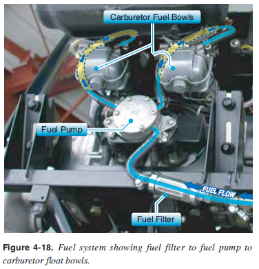 Fuel Plunger Primer The optional fuel plunger primer is used to draw fuel from the tanks to supply it directly into the engine prior to starting. This is particularly helpful during cold weather when engines are hard to start because there is not enough heat available to vaporize the fuel in the carburetor. For some aircraft, it is the only way to deliver fuel to the engine when fi rst starting. After the engine starts and is running, the fuel pump pushes fuel to the carburetors and begins normal fuel delivery. To avoid overpriming, read the priming instructions in the POH. Choke A choke or fuel enriching system is an alternate method to provide additional fuel to the engine for initial cold starting. Actuating the choke control allows more fuel to fl ow into the carburetor. Fuel Bulb Primer The fuel bulb primer is manually actuated by squeezing the bulb to draw fuel from the fuel tanks. This charges the fuel lines and carburetor fl oat bowls before starting the engine the fi rst time on a given day. After the engine starts, the fuel pump is able to deliver the fuel to the fuel bowls. An electric auxiliary fuel pump can also be used to charge the fuel lines and carburetor fuel bowls before starting. This auxiliary fuel pump is also used as a backup pump of the engine driven fuel pump fails. Fuel Gauges The fuel quantity gauge indicates the amount of fuel measured by a sensing unit in each fuel tank and is displayed in gallons. Do not depend solely on the accuracy of the fuel quantity gauge. Always visually check the fuel level in the tank during the prefl ight inspection, and then compare it with the corresponding fuel quantity indication. It is also important to track infl ight fuel consumption. Be sure to consult the POH and know the approximate consumption rate to ensure suffi cient fuel for fl ight. If an auxiliary electric fuel pump is installed in the fuel system, a fuel pressure gauge is sometimes included. This gauge indicates the pressure in the fuel lines. The normal operating pressure can be found in the POH. Fuel Filter After leaving the fuel tank, the fuel passes through a fi lter before it enters the fuel pump or carburetor. This fi lter removes sediments that might be in the fuel. [Figure 4-18] ![]() Fuel Aviation gasoline (AVGAS) is identifi ed by an octane or performance number (grade) which designates the antiknock value or knock resistance of the fuel mixture in the engine cylinder. The higher the grade of gasoline, the more pressure the fuel can withstand without detonating. Lower grades of fuel are used in lower compression engines because these fuels ignite at a lower temperature. Higher grades are used in higher compression engines, because they must ignite at higher temperatures but not prematurely. If the proper grade of fuel is not available, use the next higher grade as a substitute. Never use a lower grade. This can cause the cylinder head temperature to exceed its normal operating range, which may result in detonation. Unfortunately, AVGAS 100 Low Lead (LL) may not be recommended by two-stroke engine manufacturers and may not be preferred by the four-stroke manufactures. Even though the “LL” stands for low lead, 100LL contains more lead than the old leaded gas dispensed at automotive fi lling stations. The lead in the fuel leaves deposits in the piston ring grooves, freezing the rings in position and reducing engine performance. Spark plugs are also very susceptible to lead fouling. This is especially true in two-stroke engines that use cooler ignition temperatures than standard aircraft engines. AVGAS does have some advantages. It degrades slower than auto gas, maintaining its effi ciency for a full 3 months. AVGAS 100LL has no seasonal or regional variations and is manufactured according to a standardized “recipe” worldwide. If the airport has only 100LL available, it is permissible, absent any limitations of the engine manufacturer, to mix 100LL and auto gasoline for use in two-stroke engines. A 50–50 ratio will boost the octane rating and limit the amount of lead available for fouling. Generally speaking, this is a reasonable compromise when the proper auto gas octane is not available. Manufacturers of two-stroke engines and four-stroke engines used on WSC aircraft typically recommend the use of 89 octane minimum auto fuel for their engines. Additives are put into auto gas primarily to reduce harmful emissions rather than boost performance. The additives are supposed to be listed at the pump, but the accuracy of this posting should be questioned. Methanol alcohol has corrosive properties and can damage engines. Engine manufacturers do not recommend more than fi ve percent methanol in fuel. Consult the POH for specifi cs on an engine. Ethanol alcohol is less corrosive than methanol. However, it attracts water and is not as economical as gasoline. Ethanol does not get very good fuel economy. Avoid fuels with any more than 10 percent of ethanol. Consult the POH for specifi cs on an engine. Manufacturers provide specifi c recommendations for the percentage of alcohol in fuel. The posting on the pump may not be accurate and alcohol content can vary greatly between fuel brands and stations. Additionally, higher percentages of alcohol will be added to auto gas in the future. A simple test can be conducted to measure the fuel’s alcohol content to ensure the fuel used stays within the manufacturer’s recommendations. Use a general aviation sump collector which includes graduation marks. Add water to a specifi c mark. Then add fuel to fi ll the collector up to the line for gas. Cover the top and shake it vigorously. After it settles, the water and alcohol will combine and it will look like there is now more water in the sump collector. The difference between the initial amount of water fi rst put into the collector and the new level of combined water and alcohol equals the amount of alcohol in the fuel. Compare this amount of alcohol and the amount of 