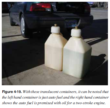 Rust is common in metal fuel containers and is a common fuel contaminant. Metal fuel tanks should be fi lled after each fl ight, or at least after the last fl ight of the day to prevent moisture condensation within the tank. Another way to prevent fuel contamination is to avoid refueling from cans and drums. Use a water fi ltering funnel or a funnel with a chamois skin when refueling from cans or drums. However, the use of a chamois will not always ensure decontaminated fuel. Worn out chamois will not fi lter water; neither will a new, clean chamois that is already water-wet or damp. Most imitation chamois skins will not fi lter water. Bad Gasoline Letting fuel sit for weeks without using it will cause it to go bad. Even if gas does not go bad, it will often lose octane with time. For premixed gasoline and two-stroke oil, there is another set of problems. Fuel and oil are normally mixed at a 50:1 ratio. If premixed gas sits in a plastic container for a while, the gas will evaporate leaving a richer oil mixture in the container. In any case, fresh gas should be used when possible. Refueling Procedures Never mix oil and fuel in an enclosed area. Not only are the fumes irritating, but with the right fuel/air mixture can cause an explosion. Do all oil and gas mixing outside. Refueling from fuel cans should also be done outside. Never smoke while refueling. Be careful when refueling an aircraft that has just landed. There is danger of spilling fuel on a hot engine component, particularly an exhaust system component. Refueling should be done using only safety-approved fuel containers marked with the type of fuel stored in them. Confusing premixed fuel and fuel that has no oil in it can be disastrous. Metal Versus Plastic Fuel Containers There are advantages to using both metal and plastic containers. Metal cans will not allow the sun’s ultraviolet rays in to harm the fuel. It also will not develop static charges that a plastic container develops. However, a metal can is more prone to sweating when going from cool to warm temperatures on humid days. Metal cans and gas tanks are best kept either empty or full of fuel to leave no room for moist air. Plastic fuel containers are easy to handle, inexpensive, available at discount stores, and do not scratch the fi nish on airframes. Plastic cans also do not sweat, and do not need to be stored topped off. However, fuel does deteriorate a little faster in plastic. Also, plastic containers can get charged with static electricity while sliding around in the bed of a pickup truck, especially if the truck has a plastic bed liner. [Figure 4-19] ![]() Many states now have laws prohibiting people from fi lling plastic containers unless fi rst placed on the ground. Static electricity can also be formed by the friction of air passing over the surfaces of a WSC aircraft in fl ight and by the fl ow of fuel through the hose and nozzle during refueling, if fueling at a pump. Nylon, Dacron, and wool clothing are especially prone to accumulate and discharge static electricity from the person to the funnel or nozzle. To guard against the possibility of static electricity igniting fuel fumes, a ground wire should be attached to the aircraft before the fuel cap is removed from the tank. The refueling nozzle should then be grounded to the aircraft before refueling is begun and should remain grounded throughout the refueling process. The passage of fuel through a chamois increases the charge of static electricity and the danger of sparks. The aircraft must be properly grounded and the nozzle, chamois fi lter, and funnel bonded to the aircraft. If a can is used, it should be connected to either the grounding post or the funnel. Cell phones should not be used while refueling due to possible fi re risks. |