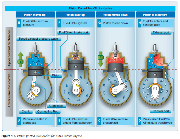 Two-Stroke Process The two-stroke process begins with the fuel entering the engine and concludes as it exits as exhaust. Crankcase Vacuum Intake Stroke—Piston Moving Up The upward stroke of the piston [Figure 4-6A] creates a vacuum in the crankcase and pulls the fuel/air/oil mixture into the crankcase through the intake valve system from the carburetor. [Figure 4-6B] This can be a pressure-actuated reed valve, a rotary valve, or a ported inlet system where the lower piston skirt provides an opening for the fuel/air/oil mixture to fl ow in when the piston is reaching its highest point of top dead center (TDC). At this point, the greatest portion of the fuel/oil/air mixture has fi lled the crankcase. [Figure 4-6B] ![]() Crankcase Compression Stroke—Piston Moving Down During the downward stroke, the pressure valve is forcibly closed by the increased crankcase pressure, the mechanical rotary valve closes, or the piston closes off the fuel/air oil mixture intake port as shown. The fuel/oil/air mixture is then compressed in the crankcase during the downward stroke of the piston. [Figures 4-6B to 4-6D] Crankcase Transfer/Exhaust—Piston at Lowest When the piston is near the bottom of its stroke, the transfer port opening from the crankcase to the combustion chamber is exposed, and the high pressure fuel/air mixture in the crankcase transfers around the piston into the main cylinder. This fresh fuel/oil/air mixture pushes out the exhaust (called scavenging) as the piston is at its lowest point and the exhaust port is open. Some of the fresh fuel/oil/air mixture can escape through the exhaust port, resulting in the higher fuel use of the two-stroke engine. [Figure 4-6D] Cylinder Start of Compression Stroke—Piston Initially Moving Up As the piston starts to move up, covering the transfer port, the tuned exhaust bounces a pressure wave at the precise time across the exhaust port to minimize the fuel/air/oil mixture escaping through the exhaust port. [Figure 4-6E] Cylinder Compression Stroke—Piston Moving Up The piston then rises and compresses the fuel mixture in the combustion chamber. [Figure 4-6E to 4-6F] During this piston compression process, the crankcase vacuum intake process is happening simultaneously, as described earlier. This is why four processes can happen in two strokes. [Figures 4-6B and 4-6C] Cylinder Power Stroke—Initial Piston Moving Down At the top of the stroke, the spark plug ignites the fuel/oil/air mixture and drives the piston down as the power stroke of the engine. [Figures 4-6F and 4-6G] Cylinder Power Stroke—Final Piston Moving Down As the piston passes the exhaust port, the exhaust exits the combustion chamber. As the piston continues down, the transfer port opens and the swirling motion of the fuel/ oil/air mixture pushes the exhaust out of the exhaust port. [Figures 4-6H] Piston Reverses Direction From Down Stroke to Up Stroke As the piston reverses direction from the down stroke to the up stroke, the process is complete. [Figures 4-6H and 4-6A] |