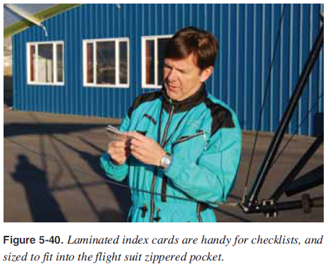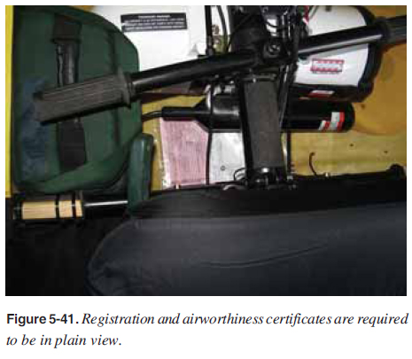 Prefl ight Inspection Each aircraft must have a routine prefl ight inspection before fl ight. Use a written checklist during prefl ight and ground operations to maintain an established procedure. [Figure 5-40] A written checklist is required so nothing is forgotten. Ground checklists include prefl ight preparation, prefl ight inspection, occupant prefl ight brief, fl ight deck management, startup, taxi, before takeoff, and aircraft shutdown. Be smart and follow the regulations—use a written checklist. All checklists should be secured so they do not fl y out of the fl ight deck in fl ight and hit the propeller. Securing with zippered pockets and having lanyards for the checklists is recommended. Manufacturers of Special Light-Sport Aircraft (S-LSA) have checklists that come with the aircraft. Pilots with an experimental aircraft may need to develop their own. ![]() Certifi cates and Documents The fi rst step of prefl ight inspection is to ensure the aircraft is legally airworthy which is determined in part, by the following certifi cates and documents: