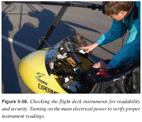 Cooling Systems Ensure there is clear airfl ow for any cooling system fan or radiator. Ensure no insects or birds created an obstruction to the airfl ow for the engine cooling system. Air cooled—rotate the propeller and ensure that the cooling fan rotates also. Water cooled—check the coolant level to ensure there is cooling fl uid in the system. Four stroke with additional oil coolers—ensure the oil cooler has clear airfl ow and that nothing is blocking it. Exhaust Systems Inspect exhaust attachment to engine, and EGT senders. Slightly jiggle the exhaust system to inspect the springs holding it together. All springs must be secure. Inspect the condition of exhaust system for cracks and attachment security. [Figure 5-57] ![]() Propeller Gearbox Rotate the propeller in the proper direction only and inspect blades for cracks or nicks. Listen and feel for smooth operation and engine compression while rotating the propeller. Inspect propeller attachment to the gearbox and the gearbox attachment to the engine. Throttle System Check all throttle controls for smooth operation and proper travel and locking. Also check choke and/or primer system for proper operation and travel. Flight Deck Inspection The following should be performed for a flight deck inspection: