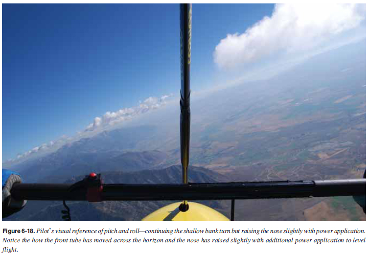 An aircraft’s maximum turning performance is its fastest rate of turn and its shortest radius of turn, which change with both airspeed and angle of bank. Each aircraft’s turning performance is limited by the amount of power its engine is developing, its limit load factor (structural strength), and its aerodynamic characteristics. Do not exceed the maximum bank angle limitation in the POH. For example, a maximum 60° bank angle is a limit used by many manufacturers. The pilot should realize the tremendous additional load that is imposed on an aircraft as the bank is increased beyond 45°. During a coordinated turn with a 60° bank, a load factor of approximately 2 Gs is placed on the aircraft’s structure. Regardless of the airspeed or the type of aircraft involved, a given angle of bank in a turn during which altitude is maintained always produces the same load factor. Pilots must be aware that an additional load factor increases the stalling speed at a signifi cant rate—stalling speed increases with the square root of the load factor. For example, a light aircraft that stalls at 40 knots in level fl ight stalls at nearly 57 knots in a 60° bank. The pilot’s understanding and observance of this fact is an indispensable safety precaution for the performance of all maneuvers requiring turns. Before starting the steep turn, the pilot should ensure that the area is clear of other air traffi c since the rate of turn is quite rapid. After establishing the manufacturer’s recommended entry speed or the design maneuvering speed, the aircraft should be smoothly rolled into a selected bank angle between 45° to 60° and the throttle increased to maintain level fl ight. Always perfect the steep turn at 45° and slowly work up to higher bank angles. As the turn is being established, control bar forward pressure should be smoothly increased to increase the angle of attack. This provides the additional wing lift required to compensate for the increasing load factor. After the selected bank angle has been reached, the pilot fi nds that considerable force is required on the control bar and increased throttle is required to hold the aircraft in level fl ight—to maintain altitude. Because of this increase in the force applied to the control bar, the load factor increases rapidly as the bank is increased. Additional control bar forward pressure increases the angle of attack, which results in an increase in drag. Consequently, power must be added to maintain the entry altitude and airspeed. During the turn, the pilot should not stare at any one object. Maintaining altitude, as well as orientation, requires an awareness of the relative position of the forward tube and the horizon. The pilot must also be looking for other aircraft mainly towards the direction of the turn while glancing at the instruments to make sure the airspeed and altitude are being maintained. If the altitude begins to increase or decrease a power adjustment may be necessary to maintain the altitude if the bank angle and speed are maintained. All bank angle changes should be done with coordinated use of pitch and throttle control. The rollout from the turn should be timed so that the wings reach level fl ight when the aircraft is exactly on the heading from which the maneuver was started. While the recovery is being made, forward bar pressure is gradually released and power reduced, as necessary, to maintain the altitude and airspeed. Common errors in the performance of steep turns are:
