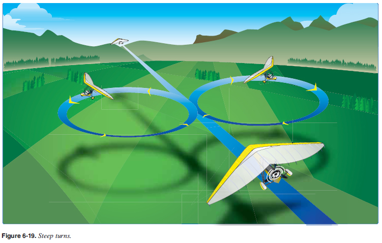 Pitch and Power No discussion of climbs and descents would be complete without touching on the question of what controls altitude and what controls airspeed. The pilot must understand the effects of both power and pitch control, working together, during different conditions of fl ight. As a general rule, power is used to determine vertical speed and pitch control is used to determine speed. However, there are many variations and combinations to this general statement. Decreasing pitch and diving do provide a quicker descent but is not typically used as a fl ight technique for long descents. Changes in pitch through moving the control bar forward and backward are used for maintaining level fl ight in rising and falling air, and pulling back on the control bar is used for a steep approach technique to lose altitude; however, these techniques are used only for short durations and not the primary altitude control for the WSC. The throttle is the main control used for determining vertical speed. At normal pitch attitudes recommended by the manufacturer and a constant airspeed, the amount of power used determines whether the aircraft climbs, descends, or remains level at that attitude. Steep Turn Performance Maneuver The objective of the steep turn performance maneuver is to develop the smoothness, coordination, orientation, division of attention, and control techniques necessary for the execution of maximum performance turns when the aircraft is near its performance limits. Smoothness of control use, coordination, and accuracy of execution are the important features of this maneuver. The steep turn maneuver consists of a level turn in either direction using a bank angle between 45° to 60°. This causes an overbanking tendency during which maximum turning performance is attained and relatively high load factors are imposed. Because of the high load factors imposed, these turns should be performed at an airspeed that does not exceed the aircraft’s design maneuvering speed (VA). The principles of an ordinary steep turn apply, but as a practice maneuver the steep turns should be continued until 360° or 720° of turn have been completed. [Figure 6-19]