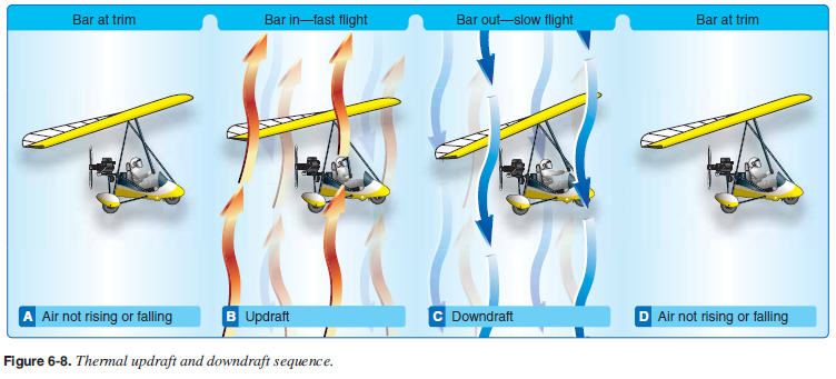 ![]() Straight-and-Level Flying Flying straight and level is the most important flight maneuver to master. It is impossible to emphasize too strongly the necessity for forming correct habits in fl ying straight and level. All fl ight is in essence a deviation from this fundamental fl ight maneuver. It is not uncommon to fi nd a pilot whose basic fl ying ability consistently falls just short of minimum expected standards, and upon analyzing the reasons for the shortcomings discover that the cause is the inability to fl y straight and level properly. In learning to control the aircraft in level fl ight, it is important that the control forces be exerted just enough to produce the desired result. Some wings are more responsive than others. The student should learn to associate the apparent movement of the control bar with the response in pitch and roll. In this way, the student can develop the ability to regulate the change desired in the aircraft’s attitude by the amount and direction of forces applied to the controls without the necessity of referring to outside references for each minor correction. Straight-and-level flight is flight in which a constant heading and altitude are maintained. It is accomplished by making immediate and measured corrections for deviations in direction and altitude from unintentional slight turns, descents, and climbs. Level fl ight is a matter of consciously fi xing the relationship of the position of something on the aircraft, used as a reference point with a point on the horizon. In establishing the reference point on the aircraft, place the aircraft in the desired position and select a reference point. A typical reference point on the WSC aircraft is a point on the front tube. The WSC aircraft reference point depends on where the pilot is sitting, the pilot’s height (whether short or tall), and the pilot’s manner of sitting. It is, therefore, important when establishing this relationship, the pilot sit in a normal manner; otherwise the points will not be the same when the normal position is resumed. [Figures 6-6 and 6-7] ![]() ![]() Straight-and-level fl ight should fi rst be practiced in calm air where the control movements determine the actual movement through the air and air movement has minimal effect on the aircraft’s altitude and direction. A trim speed needs to be set if the WSC aircraft has an infl ight trim system or the trim speed set on the ground is used. The throttle is adjusted so the aircraft is fl ying level, not climbing or descending. This can be determined by looking at the altimeter or the vertical speed indicator (if so equipped). The throttle setting is the control for maintaining level fl ight for a specifi c weight, loading, trim speed, and density altitude. Level fl ight is maintained by selecting some portion of the aircraft’s nose as a reference point, and then keeping that point in a fi xed position relative to the horizon. Using the principles of attitude fl ying, that position should be crosschecked occasionally against the altimeter to determine whether or not the throttle setting and pitch attitude are correct. If altitude is being gained or lost, the pitch attitude should be readjusted with the throttle in relation to the horizon. Then, recheck the altimeter to determine if altitude is being maintained and adjust the throttle accordingly. The throttle setting for this condition should be noted and all future changes in weight, trim speed, and density altitude referenced to this known throttle setting. After level fl ight is mastered in calm air, it can be practiced in air that is moving, minor turbulence or “active air.” The throttle settings for similar weight, trim, and density altitude are the same, but more pilot input is required to maintain a constant altitude. The throttle is used to maintain a selected distance above the reference point for local air movement, but the pitch pressure (nose up or nose down) is used to control this attitude for shorter duration air disturbances. Typically, updrafts or thermals raise the nose of the aircraft and downdrafts at the edge of thermals lower the nose of the aircraft. For minor updrafts the nose is lowered by pitch control input by the pilot slightly increasing the speed of the aircraft to keep the pitch at a constant level. In moderate to severe updrafts, the throttle can be reduced to assist in maintaining a reasonably constant pitch angle with the horizon. Similarly for minor downdrafts that lower the nose, the nose is raised by pitch control input by the pilot slightly decreasing the speed of the aircraft to keep the pitch at a constant level. An additional caution for raising the nose and decreasing the speed is that raising the nose too high could stall the aircraft. Therefore, caution must be exercised in moderate downdrafts not to reduce the speed too much to approach a stall speed/ critical angle of attack. Similar to reducing the throttle in updrafts to reduce pitch angle, increasing the throttle typically increases the pitch angle. [Figure 6-8] ![]() WSC aircraft can use the front tube as a reference to align perpendicular with the horizon and the wings leveled. It should be noted that any time the wings are banked even slightly, the aircraft will turn. The front tube can be used as an indicator to determine turn rate. If the bar is moving side to side to any established reference point, the aircraft is banked and should be corrected to eliminate any turn. The objective of straight-and-level fl ight is to detect small deviations from level fl ight as soon as they occur, necessitating only small corrections. Straight-and-level fl ight requires almost no application of control pressures if the aircraft is properly trimmed and the air is smooth. For that reason, pilots must not form the habit of constant, unnecessary control movement. Pilots should learn to recognize when corrections are necessary, and then make a measured response easily and naturally. C