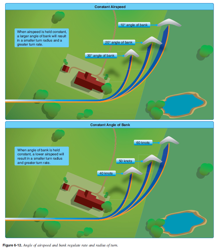 When changing from a shallow bank to a medium bank, the airspeed of the wing on the outside of the turn increases in relation to the inside wing as the radius of turn decreases. The additional lift developed because of this increase in speed of the wing balances the inherent lateral stability of the aircraft. At any given airspeed, roll pressure is not required to maintain the bank. If the bank is allowed to increase from a medium to a steep bank, the radius of turn decreases further. A steep bank is similar to a medium bank but all factors increase. Roll and pitch control pressures must increase, throttle must increase further to maintain altitude, and the G forces increase signifi cantly. Students should build up to steep banked turns gradually after perfecting shallow and medium banked turns. Do not exceed the bank angle limitation in the Pilot’s Operating Handbook (POH). The pilot’s posture while seated in the aircraft is very important, particularly during turns. It affects the interpretation of outside visual references. Pilots should not lean away from the turn in an attempt to remain upright in relation to the ground rather than ride with the aircraft. This should be a habit developed early so that the pilot can properly learn to use visual references. Beginning students should not use large control applications because this produces a rapid roll rate and allows little time for corrections before the desired bank is reached. Slower (small control displacement) roll rates provide more time to make necessary pitch and bank corrections. As soon as the aircraft rolls from the wings-level attitude, the nose should also start to move along the horizon, increasing its rate of travel proportionately as the bank is increased. The following variations provide excellent guides. If the nose moves up or down when entering a bank, excessive or insuffi cient pitch control is being applied. During all turns, the controls are used to correct minor variations as they are in straight-and-level fl ight. Instruction in level turns should begin with changing attitude from level to bank, bank to level, and so on with a slight pause at the termination of each phase. This pause allows the WSC to free itself from the effects of any misuse of the controls and ensures a correct start for the next turn. During these exercises, the idea of control forces, rather than movement, should be emphasized by pointing out the resistance of the controls to varying forces applied to them. Common errors in the performance of level turns are: