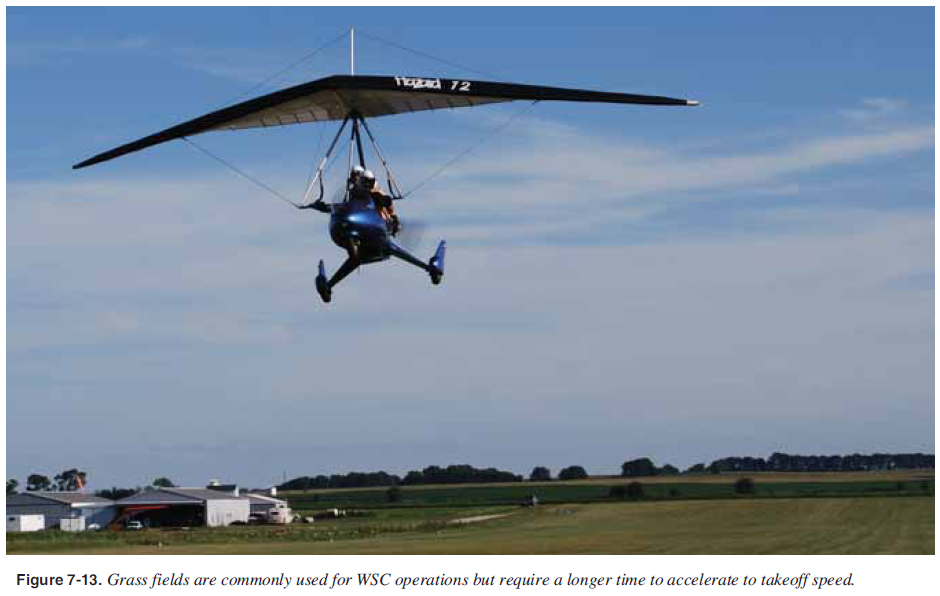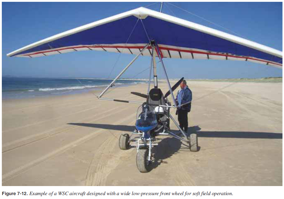 Soft/Rough Field Takeoff and Climb Takeoffs and climbs from soft fi elds require the use of operational techniques for getting the WSC aircraft airborne as quickly as possible to eliminate the drag caused by tall grass, soft sand, mud, and snow, and may or may not require climbing over an obstacle. The technique makes judicious use of ground effect and requires a feel for the WSC aircraft and fi ne control touch. These same techniques are also useful on a rough fi eld where it is advisable to get the aircraft off the ground as soon as possible to avoid damaging the landing gear. Soft surfaces or long, wet grass usually reduce the aircraft’s acceleration during the takeoff roll so much that adequate takeoff speed might not be attained if normal takeoff techniques were employed. It should be emphasized that the WSC aircraft is different from most aircraft. The high wing creates a high center of gravity in which the front wheel can bog down in soft fi elds and fl ip the WSC aircraft forward. The propeller in the back pushing down on the front wheel also contributes to this unique situation. This is a limitation for WSC aircraft that should not be ignored. WSC aircraft that land in soft fi elds or sand may not be able to take off. There is a wide variation of manufacturer designs with the least preferable being a skinny, high pressure, highly loaded front tire. WSC aircraft with large wide tires that can be operated at low pressure are designed for operation in soft and rough fi elds. [Figures 7-11 through 7-13]