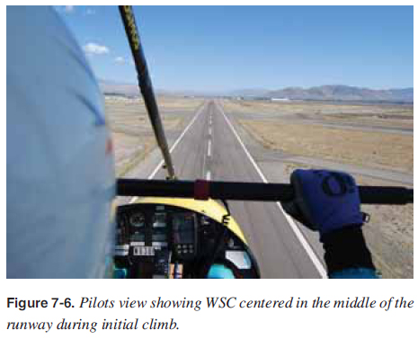 After liftoff and throughout the climb, the engine instruments should be checked for proper cooling and oil pressure (if so equipped) since this is the critical time when temperature rises and should stabilize within the manufacturer’s specifi cations. The manufacturer’s recommended takeoff power should be maintained until reaching an altitude of at least 500 feet above the surrounding terrain or obstacles. The combination of VY and takeoff power assures the maximum altitude gained in the time during takeoff. This provides the pilot the greatest altitude from which the aircraft can be safely maneuvered in case of an engine failure or other emergency. Since the power on the initial climb is fi xed at the takeoff power setting, the airspeed must be controlled by making slight pitch adjustments using the control bar. However, the pilot should not fi xate on the airspeed indicator when making these pitch changes, but continue to scan outside to adjust the attitude in relation to the horizon and the feel of the aircraft. The WSC aircraft can be fl own by using bar position and the feel of the air to determine proper airspeed; it is not necessary to look at the airspeed indicator to determine exact airspeed. In accordance with the principles of fl ying a WSC aircraft, the pilot should fi rst make the necessary pitch change with reference to the bar position, and then glance at the airspeed indicator as a check to see if the new speed is correct. After the recommended climb airspeed has been established and a safe maneuvering altitude has been reached, the power should be adjusted to the recommended climb setting (if different) and the WSC aircraft trimmed (if so equipped) to relieve the control pressures. This makes it easier to hold a constant attitude and airspeed. During initial climb, it is important that the takeoff path remain aligned with the runway to avoid drifting into obstructions or the path of another aircraft that may be taking off from a parallel runway. Proper scanning techniques are essential to a safe takeoff and climb, not only for maintaining attitude and direction, but also for collision avoidance in the airport area. [Figure 7-6]