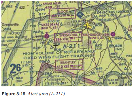 Alert Areas Alert areas are depicted on sectional charts with an “A” followed by a number (e.g., “A-211” as in Figure 8-16) to inform nonparticipating pilots of areas that may contain a high volume of pilot training or an unusual type of aerial activity. Pilots should be particularly alert when fl ying in these areas. All activity within an alert area shall be conducted in accordance with regulations, without waiver. Pilots of participating aircraft, as well as pilots transiting the area, shall be equally responsible for collision avoidance.