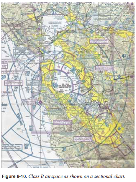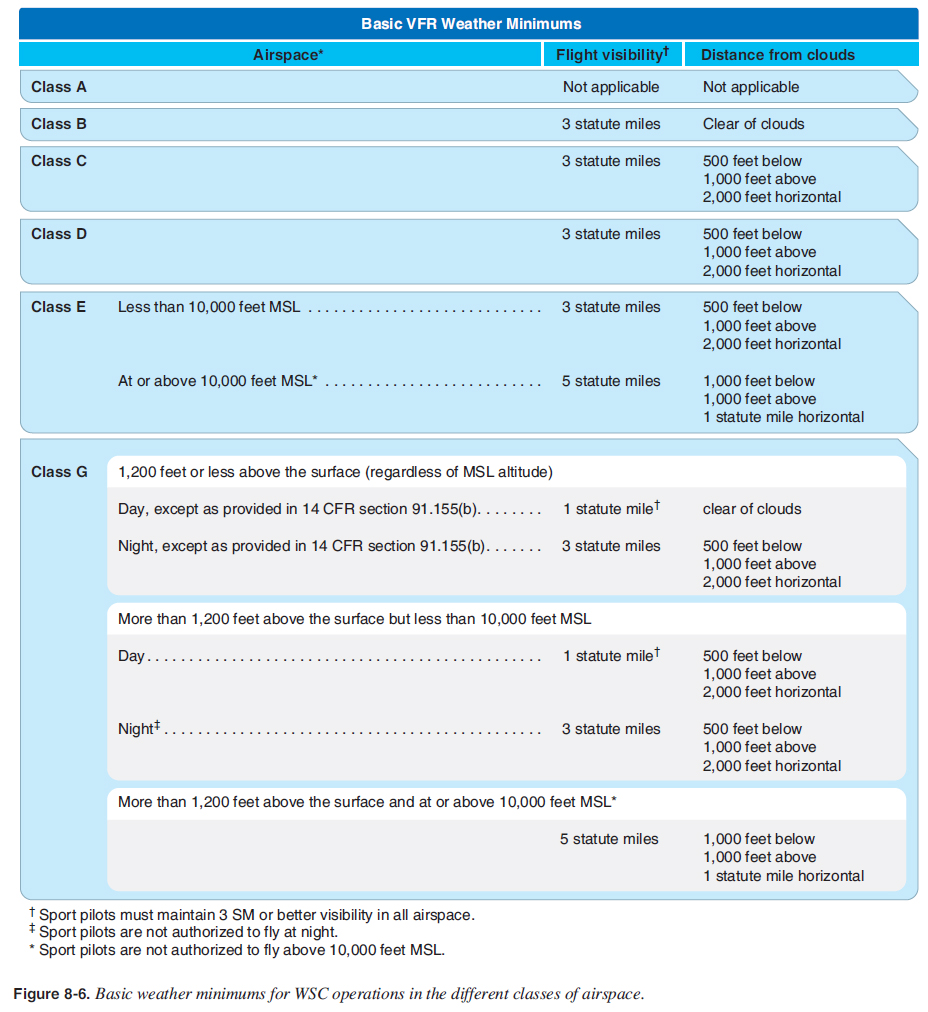 Equipment requirements are the same as for Class C airspace; however, due to air traffi c congestion, the WSC aircraft pilot requesting entry to Class B airspace may be denied entry. Since aircraft operating in Class B airspace have a radar signature and ATC provides aircraft separation, there is a difference in the cloud clearance requirements. Visibility remains three statute miles, but minimum cloud clearance requirement is to remain clear of clouds. [Figure 8-6]