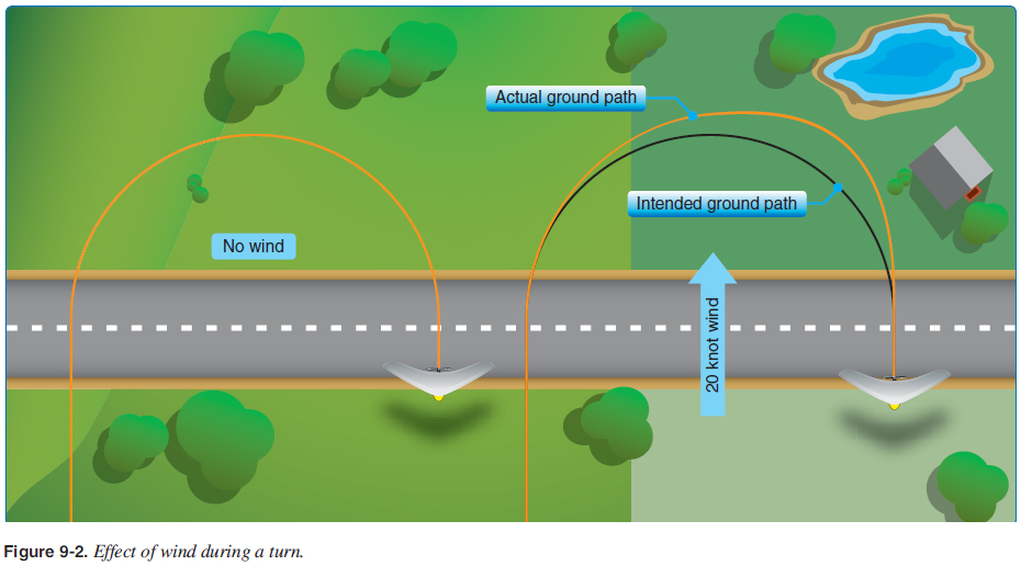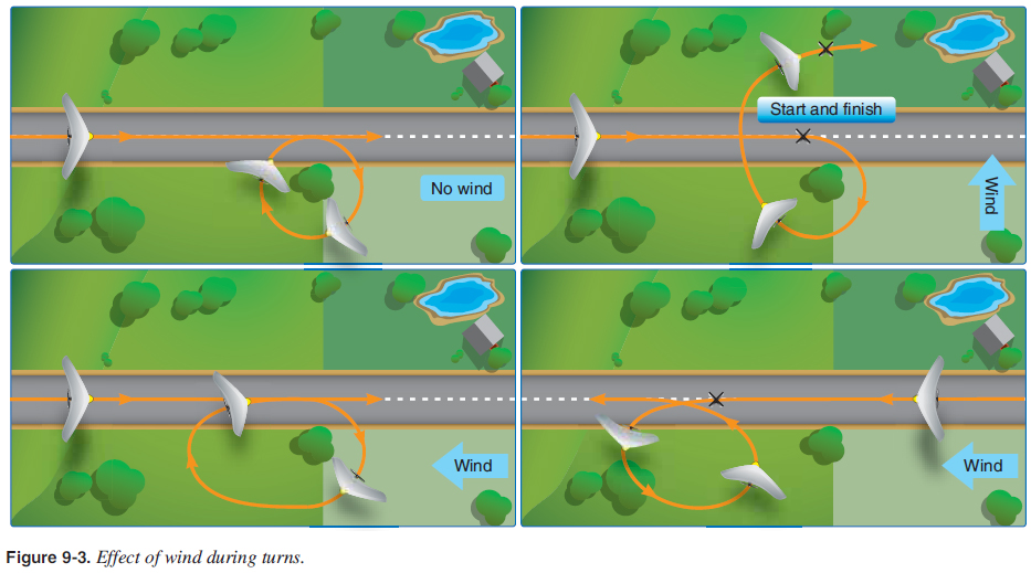 To follow a desired circular ground track, the wind correction angle must be varied in a timely manner because of the varying groundspeed as the turn progresses. The faster the groundspeed, the faster the wind correction angle must be established; the slower the groundspeed, the slower the wind correction angle may be established. It can be seen then that the steepest bank and fastest rate of turn should be made on the downwind portion of the turn and the shallowest bank and slowest rate of turn on the upwind portion. The principles and techniques of varying the angle of bank to change the rate of turn and wind correction angle for controlling wind drift during a turn are the same for all ground track maneuvers involving changes in direction of fl ight. When there is no wind, it should be simple to fl y along a ground track with an arc of exactly 180° and a constant radius because the fl ightpath and ground track would be identical. This can be demonstrated by approaching a road at a 90° angle and, when directly over the road, rolling into a medium-banked turn. Then, maintaining the same angle of bank throughout the 180° of turn. [Figure 9-2] To complete the turn, the rollout should be started at a point where the wings become level as the aircraft again reaches the road at a 90° angle and is directly over the road just as the turn is completed. This would be possible only if there were absolutely no wind and if the angle of bank and the rate of turn remained constant throughout the entire maneuver. If the turn were made with a constant angle of bank and a wind blowing directly across the road, it would result in a constant radius turn through the air. However, the wind effects would cause the ground track to be distorted from a constant radius turn or semicircular path. The greater the wind velocity, the greater the difference between the desired ground track and the fl ightpath. To counteract this drift, the fl ightpath can be controlled by the pilot in such a manner as to neutralize the effect of the wind and cause the ground track to be a constant radius semicircle. The effects of wind during turns can be demonstrated after selecting a road, railroad, or other ground reference that forms a straight line parallel to the wind. Fly into the wind directly over and along the line and then make a turn with a constant medium angle of bank for 360° of turn. [Figure 9-3] The aircraft returns to a point directly over the line but slightly downwind from the starting point, the amount depending on the wind velocity and the time required to complete the turn. The path over the ground is an elongated circle, although in reference to the air it is a perfect circle. Straight fl ight during the upwind segment after completion of the turn is necessary to bring the aircraft back to the starting position.