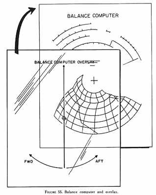 The circular balance computer consists of a card and a curved c.g. grid. A different card is provided for each configuration aircraft and can be included in the weight and balance section of the aircraft flight manual. A transparent plastic overlay sheet with a simple straight line similar to the cursor on the load adjuster is used on top of the balance computer card (fig. 55).