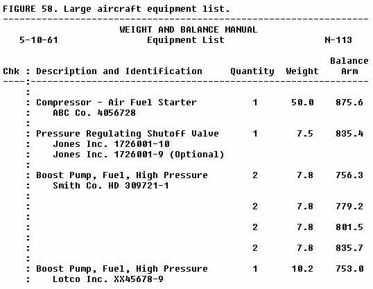 The aircraft is weighed to establish the empty weight and c.g. before it is put into service. When a record is made of this weighing, an equipment list is established which shows each item of installed equipment included in the empty weight. From then on, the condition for empty weight can be duplicated by assuring that this same equipment is installed. An excerpt from the equipment list of an FAA aircraft is shown in figure 58.