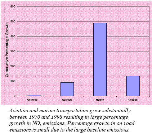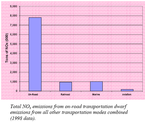 Aviation has grown faster than other modes of transportation and is expected to outpace them in the future. Despite this growth, aviation’s contribution to local air quality inventories compared to other transportation sources has remained modest. For example, as the chart shows, the rate of growth in aviation NOx emissions has far outpaced on-road (i.e., cars and trucks) NOx emissions growth. However, as the next chart shows, the quantity of emissions of other transport modes far exceeds aviation’s NOx contribution. This is not surprising as most of an aircraft’s operations take place at altitude where emissions do not affect local air quality. This is in contrast to cars and trucks that primarily operate within a single air quality region and always at ground level. In the future, NOx emissions from on-road vehicles should fall in response to the most recent environmental regulations. Aircraft, on the other hand, will be challenged to reduce their total NOx emissions. However, even if the other sources were able to reduce their emissions by half, a highly unlikely occurrence, aviation NOx emissions would still be less than 3 percent of the transportation NOx inventory by 2020. Nonetheless, pressure on aviation sources will likely remain as many states and localities will face the twin challenges of meeting new ozone and particulate matter standards at the same time non-aviation source reductions become more difficult and costly. |