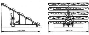 In 1895 E.S.Fedorov came up with project of the 5-plane powered aircraft. First, he tested a model. It was not powered, but flown on a leash as a kit. In 1896 he started to build full size aircraft on his own money. By general layout aircraft may be called 'single-seat 5-plane tandem'. Wings (dubbed 'feathers' by designer) were installed on the tilted (300) strut. Pilot's seat and engine were installed under the strut. Aircraft had no ether fin or rudder, control should be performed by twisting the wings. Construction lasted until 1903, aircraft was finished - but not tested. It was the second full-size powered aircraft to be built in Russia. E.S.Fedorov could be unaware of A.F.Mozhajskij experiments. As a result, after very advanced layout of 'Samoliot Mozhajskogo' several primitive designs appeared. 5-plane was not an exception. |