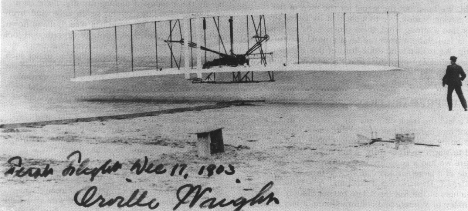 ![]() The first manned flight in history: December 17, 1903. At 10:35 am, Orville Wright takes off into a 27 mph wind. The distance covered was 120 feet: time aloft was 12 seconds. Wilbur is seen at right, Picture was taken with Orville's camera by John T. Daniels. |