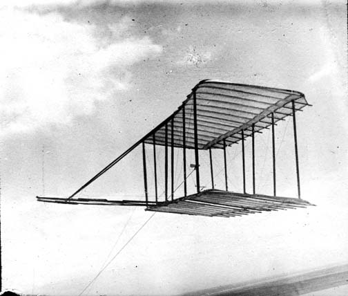 It seemed reasonable that if the body of the operator could be placed in a horizontal position instead of the upright, as in the machines of Lilienthal, Pilcher, and Chanute, the wind resistance could be very materially reduced since only 1 square foot instead of 5 would be exposed. As a full half horsepower could be saved by this change, we arranged to try at least the horizontal position. Then the method of control used by Lilienthal, which consisted in shifting the body, did not seem quite as quick or effective as the case required; so, after long study, we contrived a system consisting of two large surfaces on the Chanute double-deck plan, and a smaller surface placed a short distance in front of the main surfaces in such a position that the action of the wind upon it would counterbalance the effect of the travel of the center pressure on the main surfaces. Thus changes in the direction and velocity of the wind would attend only to the steering of the machine, which was to be affected by curving the forward surface up or down. The lateral equilibrium and the steering to right or left was to be attained by a peculiar torsion of the main surfaces, which was equivalent to presenting one end of the wings at a greater angle than the other. In the main frame a few changes were also made in the details of construction and trussing employed by Mr. Chanute. The most important of these were (1) the moving of the forward main crosspiece of the frame to the extreme front edge; (2) the encasing in the cloth of all crosspieces and ribs of the surfaces; (3) a rearrangement of the wires used in trussing the two surfaces together, which rendered it possible to tighten all the wires by simply shortening two of them.