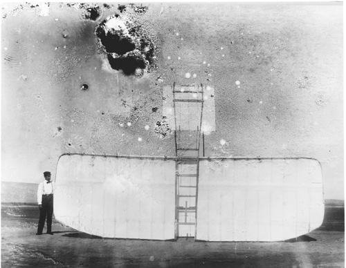 Our experience of the previous year having shown the necessity of a suitable building for housing the machine, we erected a cheap frame building, 16 feet wide, 25 feet long, and 7 feet high at the eaves. As our machine was 22 feet wide, 14 feet long (including the rudder), and about 6 feet high, it was not necessary to take the machine apart in any way in order to house it. Both ends of the building, except the gable parts, were made into doors, which hinged above, so that when opened they formed an awning at each end and left an entrance the full width of the building. We went into camp about the middle of July, and were soon joined by Mr. E. C. Huffaker of Tennessee, an experienced aeronautical investigator in the employ of Mr. Chanute, by whom his services were kindly loaned, and by Dr. G. A. Spratt, of Pennsylvania, a young man who has made some valuable investigations of the properties of variously curved surfaces and the travel of the center of pressure thereon. Early in August Mr. Chanute came down from Chicago to witness our experiments and spent a week in camp with us. These gentlemen, with my brother and myself, Formed our camping party, but in addition we had in many of our experiments the valuable assistance of Mr. W. J. Tate and Mr. Dan. Tate, of Kittyhawk.
