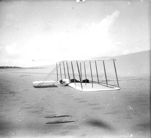 The machine was completed and tried for the first time on the 27th of July in a wind blowing about 13 miles an hour. The operator having taken a position where the center of pressure was supposed to be, an attempt at gliding was made, but the machine turned downward and landed after going only a few yards. This indicated that the center of gravity was too far in front of the center of pressure. In the second attempt the operator took a position several inches farther back, but the result was much the same. He kept moving farther and farther back with each trial, till finally he occupied a position nearly a foot back of that at which we had expected to find the center of pressure. The machine then sailed off and made an undulating flight of a little more than 300 feet. To the onlookers this flight seemed very successful, but to the operator it was known that the full power of the rudder had been required to keep the machine from either running into the ground or rising so high as to lose all headway. In the 1900 machine one-fourth as much rudder action had been sufficient to give much better control. It was apparent that something was radically wrong, though we were for some time unable to locate the trouble.