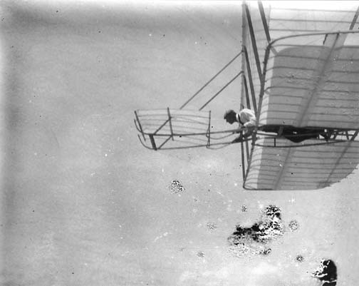 In one glide the machine rose higher and higher till it lost all headway. This was the position from which Lilienthal had always found difficulty to extricate himself, as his machine then, in spite of his greatest exertions, manifested a tendency to dive downward almost vertically and strike the ground head on with frightful velocity. In this case a warning cry from the ground caused the operator to turn the rudder to its full extent and also to move his body slightly forward. The machine then settled slowly to the ground, maintaining its horizontal position almost perfectly, and landed without any injury at all. This was very encouraging, as it showed that one of the very greatest dangers in machines with horizontal tails had been overcome by the use of a front rudder. Several glides later the same experience was repeated with the same result. In the latter case the machine had even commenced to move backward, but was nevertheless brought safely to the ground in a horizontal position. On the whole, this day's experiments were encouraging, for while the action of the rudder did not seem at all like that of our 1900 machine, yet we had escaped without difficulty from situations which had proved very dangerous to preceding experimenters, and after less than one minute's actual practice had made a glide of more than 300 feet, at an angle of descent of 10°, and with a machine nearly twice as large as had previously been considered safe.