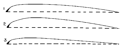 For several days we were in a state of indecision, but were finally convinced by observing the following phenomena (fig. l): We had removed the upper surface from the machine and were flying it in a wind to see at what angles it would be supported in winds of different strengths. We noticed that in light winds it flew in the upper position shown in the figure, with a strong upward pull on the cord c. As the wind became stronger the angle of incidence became less, and the surface flew in the position shown in the middle of the figure, with a slight horizontal pull; but when the wind became still stronger it took the lower position shown in the figure, with a strong downward pull. It at once occurred to me that here was the answer to our problem, for it is evident that in the first case the center of pressure was in front of the center of gravity, and thus pushed up the front edge; in the second case they were in coincidence and the surface in equilibrium, while the third case the center of pressure had reached a point even behind the center of gravity, and there was therefore a downward pull on cord. This point having been definitely settled, we proceeded to truss down the ribs of the whole machine, so as to reduce the depth of curvature. In fig. 2 line l shows the original curvature; line 2, the curvature when supporting the operator's weight, and line 3, the curvature after trussing.